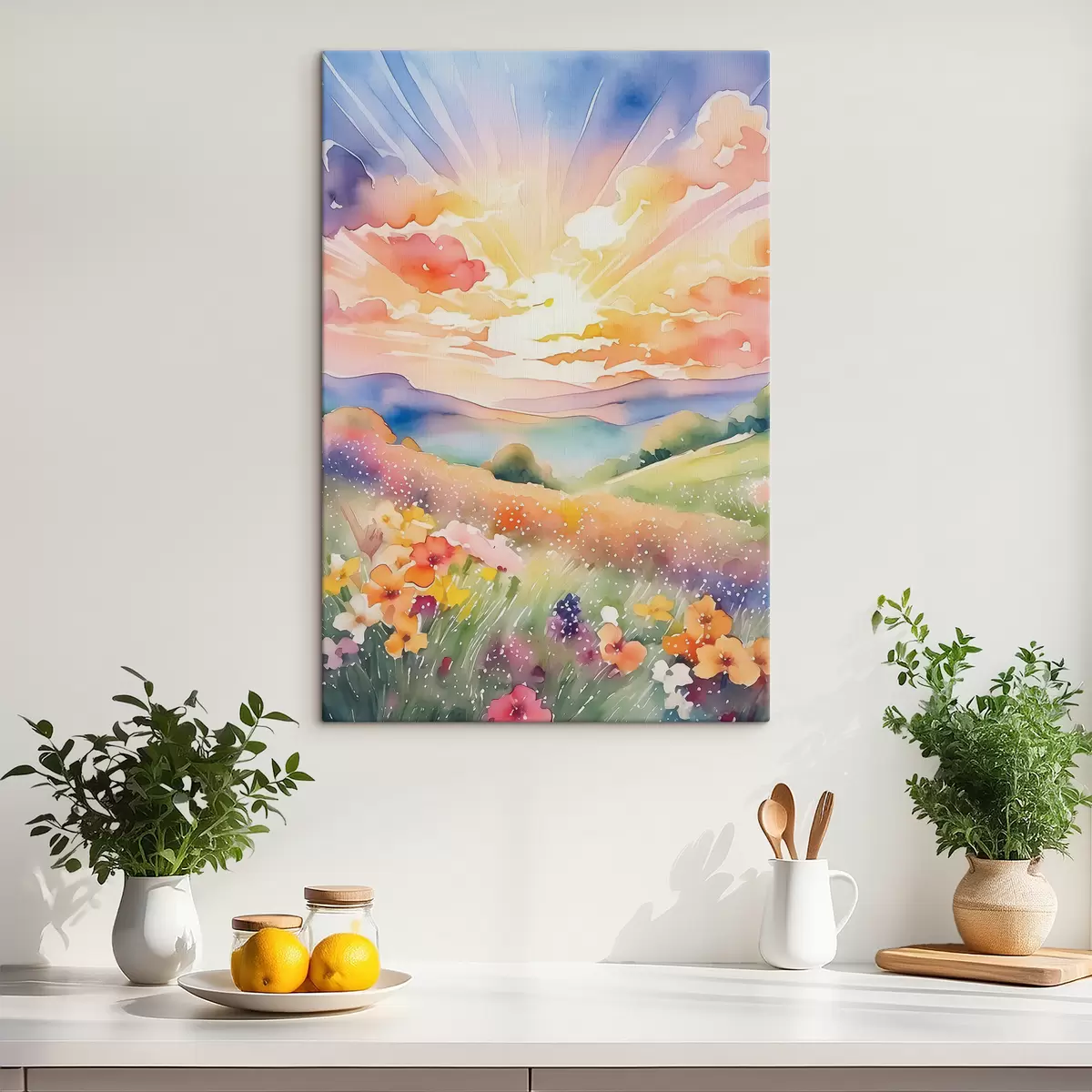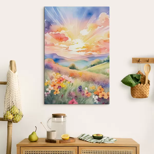 Quadri Tramonto nel campo estivo, fiori, sole, cielo colorato, nuvole, natura Nr s38842