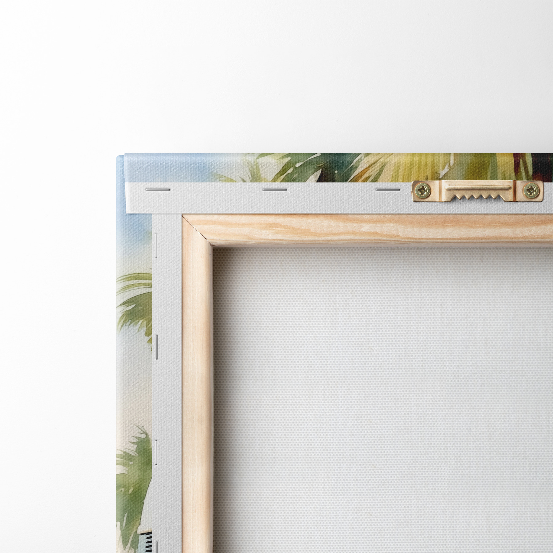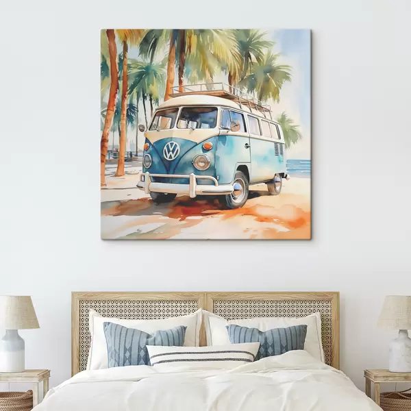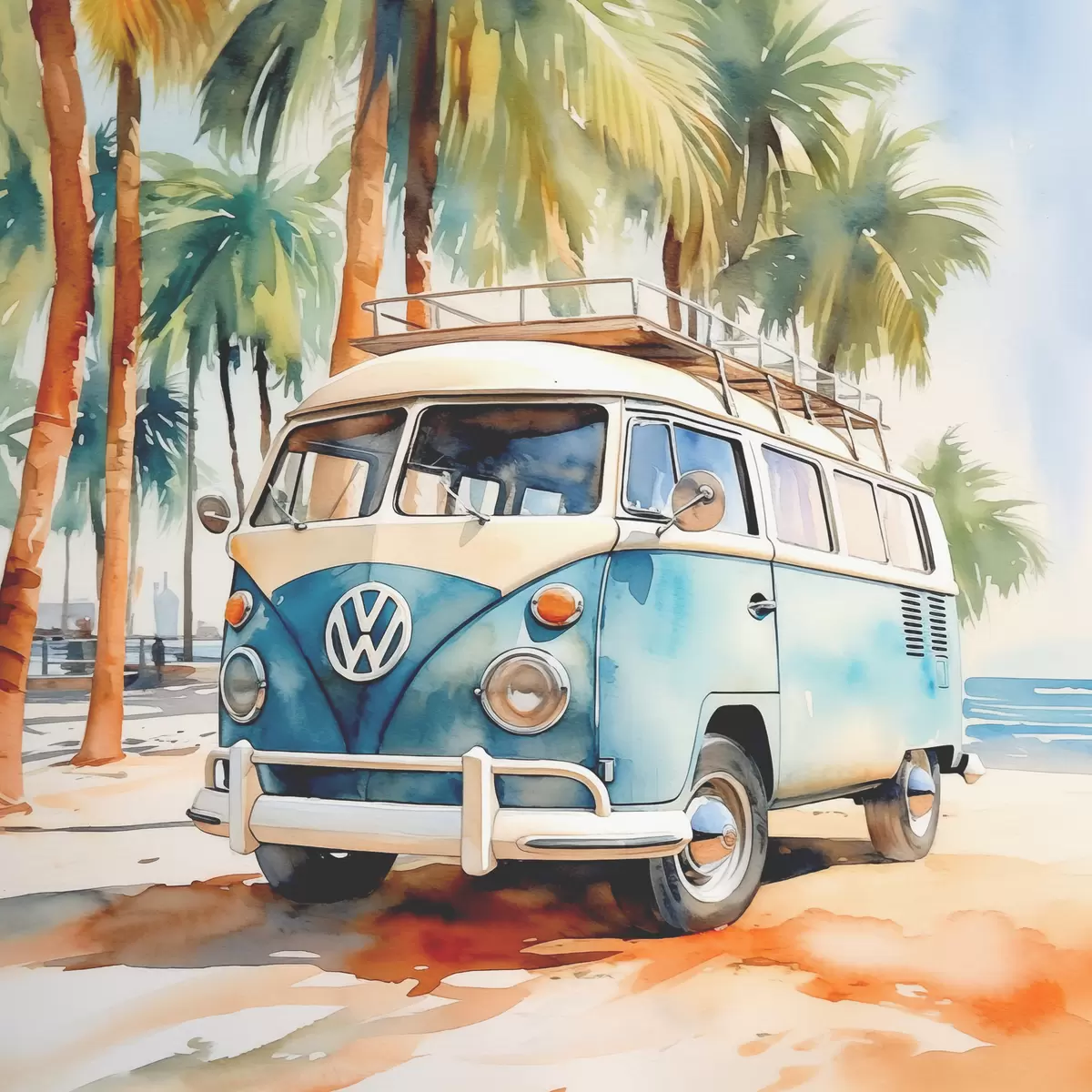 Quadri Un'auto da viaggio è parcheggiata sulla spiaggia su uno sfondo di palme acquerellate Nr s38911