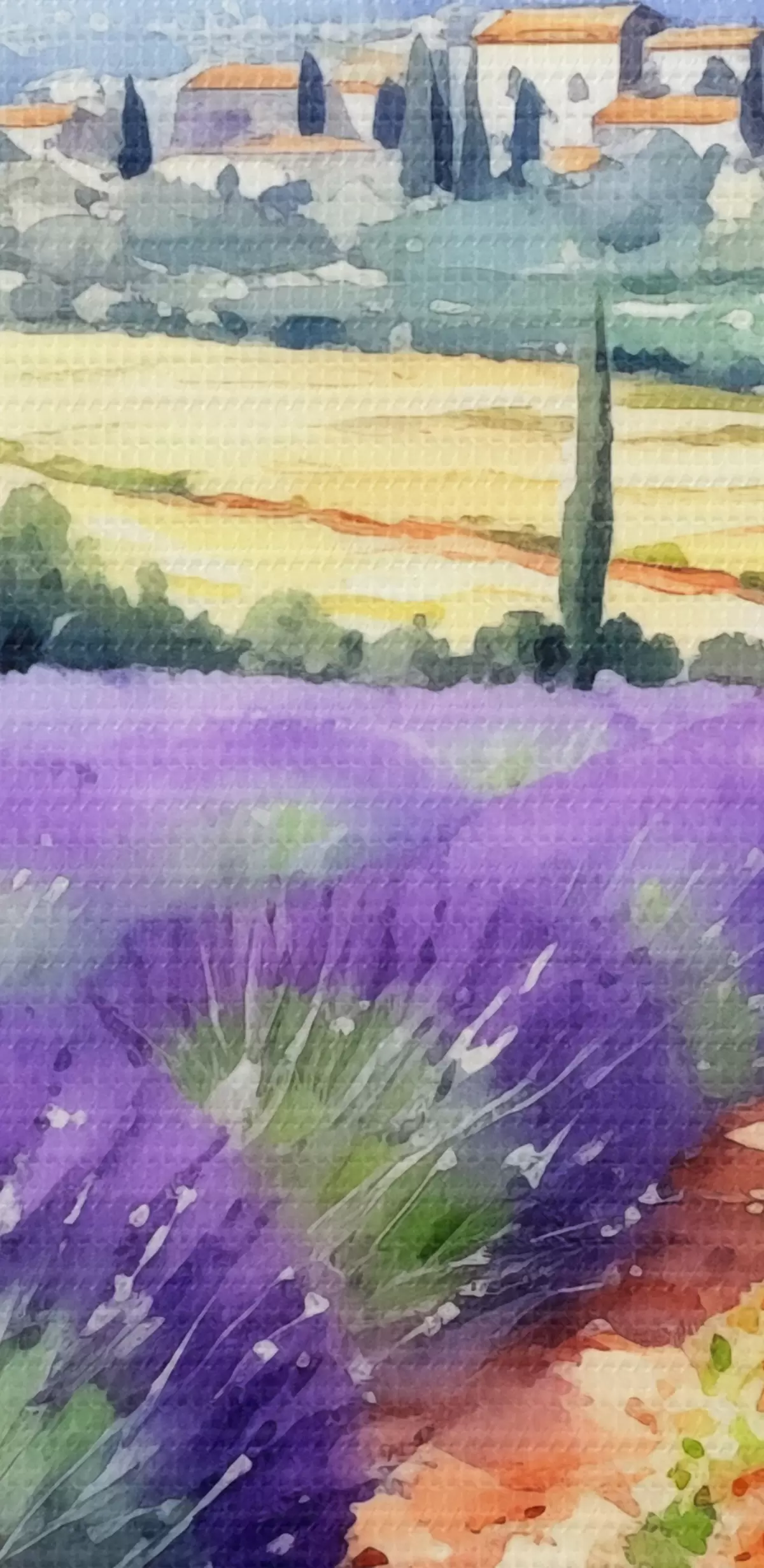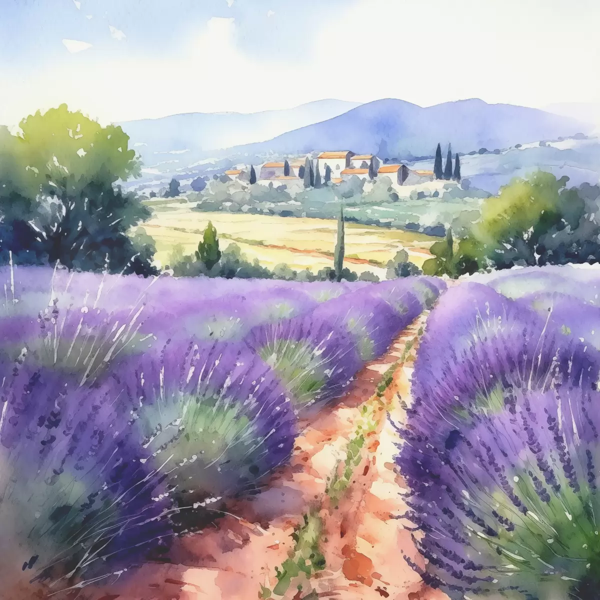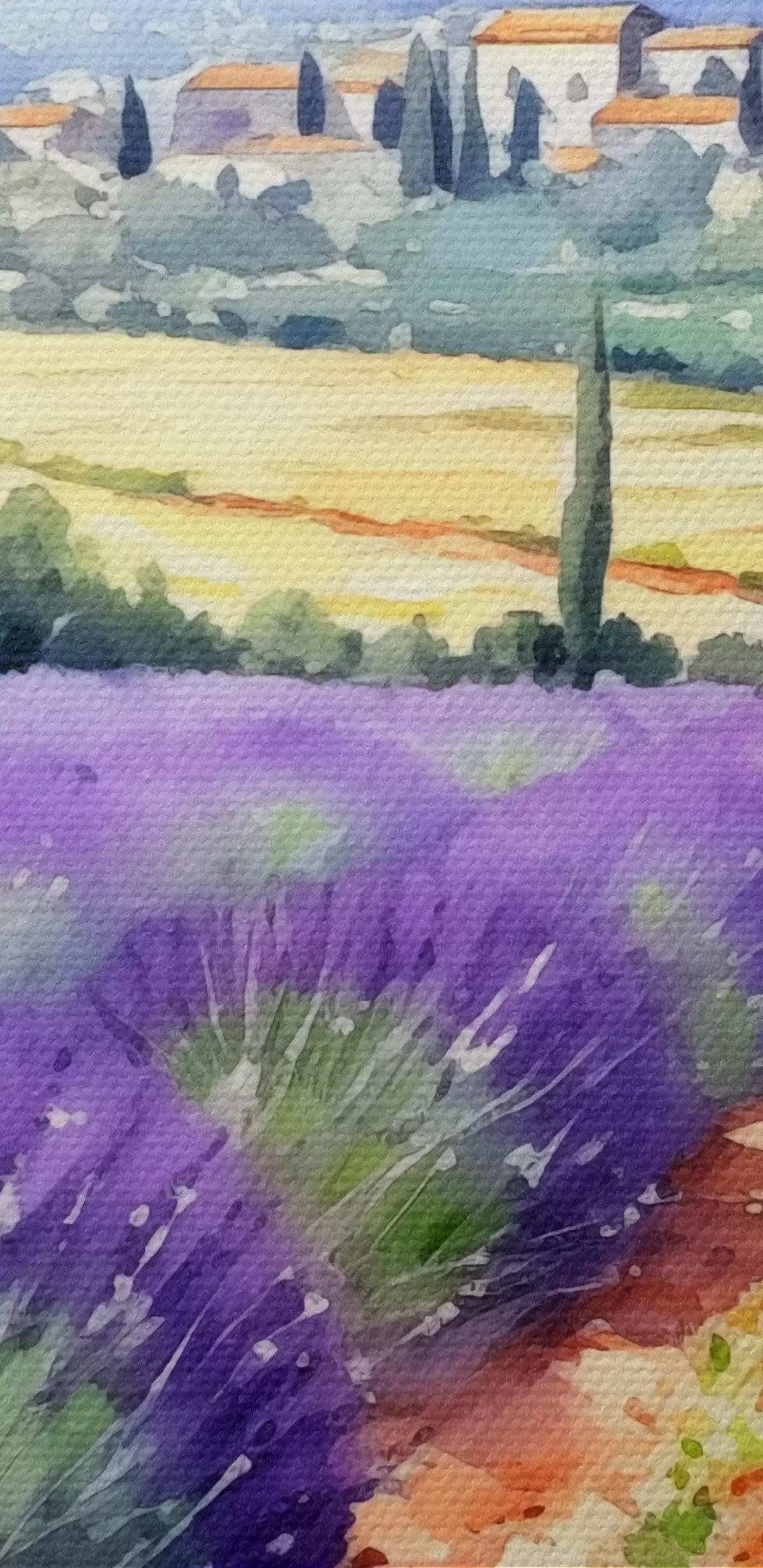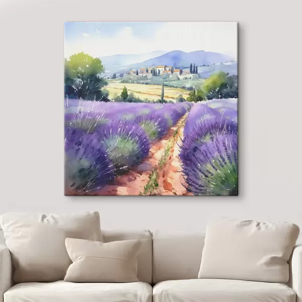 Quadri Campo di lavanda dell'acquerello su uno sfondo di montagne e campagna Nr s38913