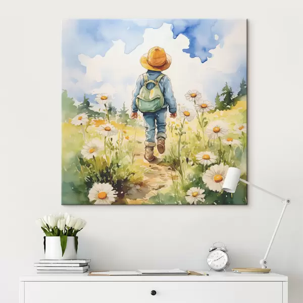 Quadri Un ragazzo con un cappello da cowboy con uno zaino verde dietro la schiena e un abito blu cammina lungo un sentiero in un campo di camomilla, acquerello Nr s38946