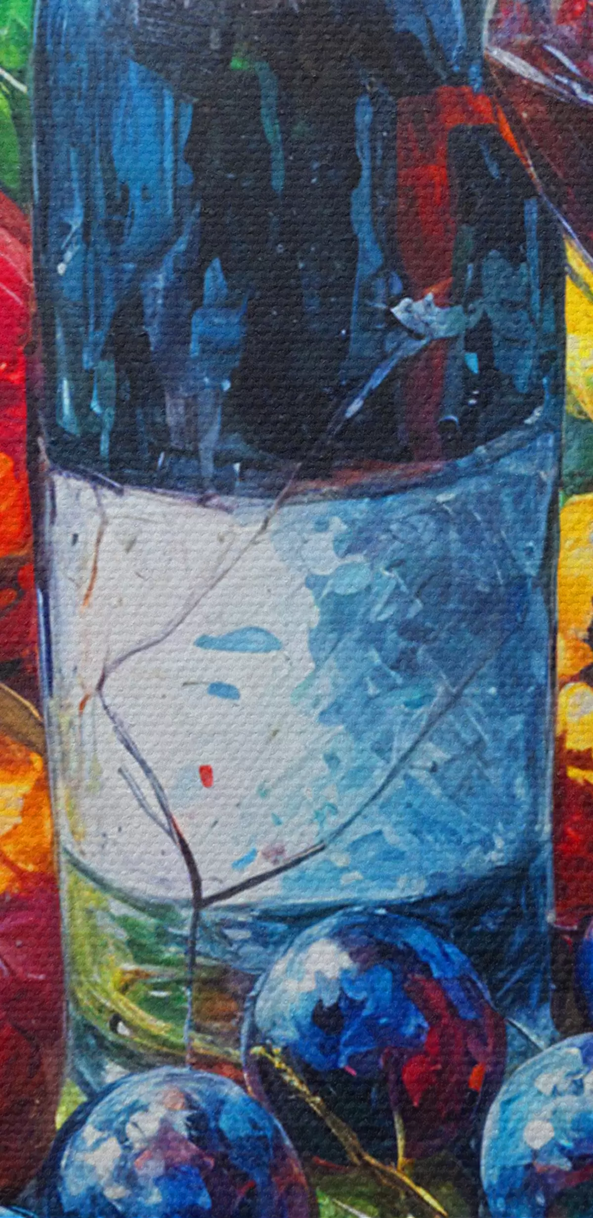 Quadri Dipinto astratto di natura morta di una bottiglia di vino, un bicchiere di vino e frutti colorati con schizzi di vari colori Nr s38958