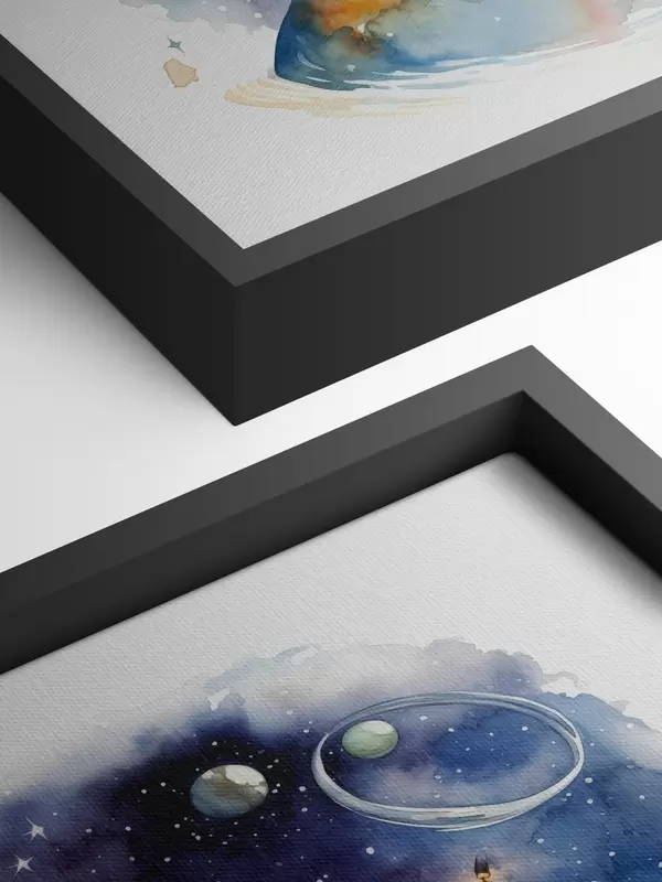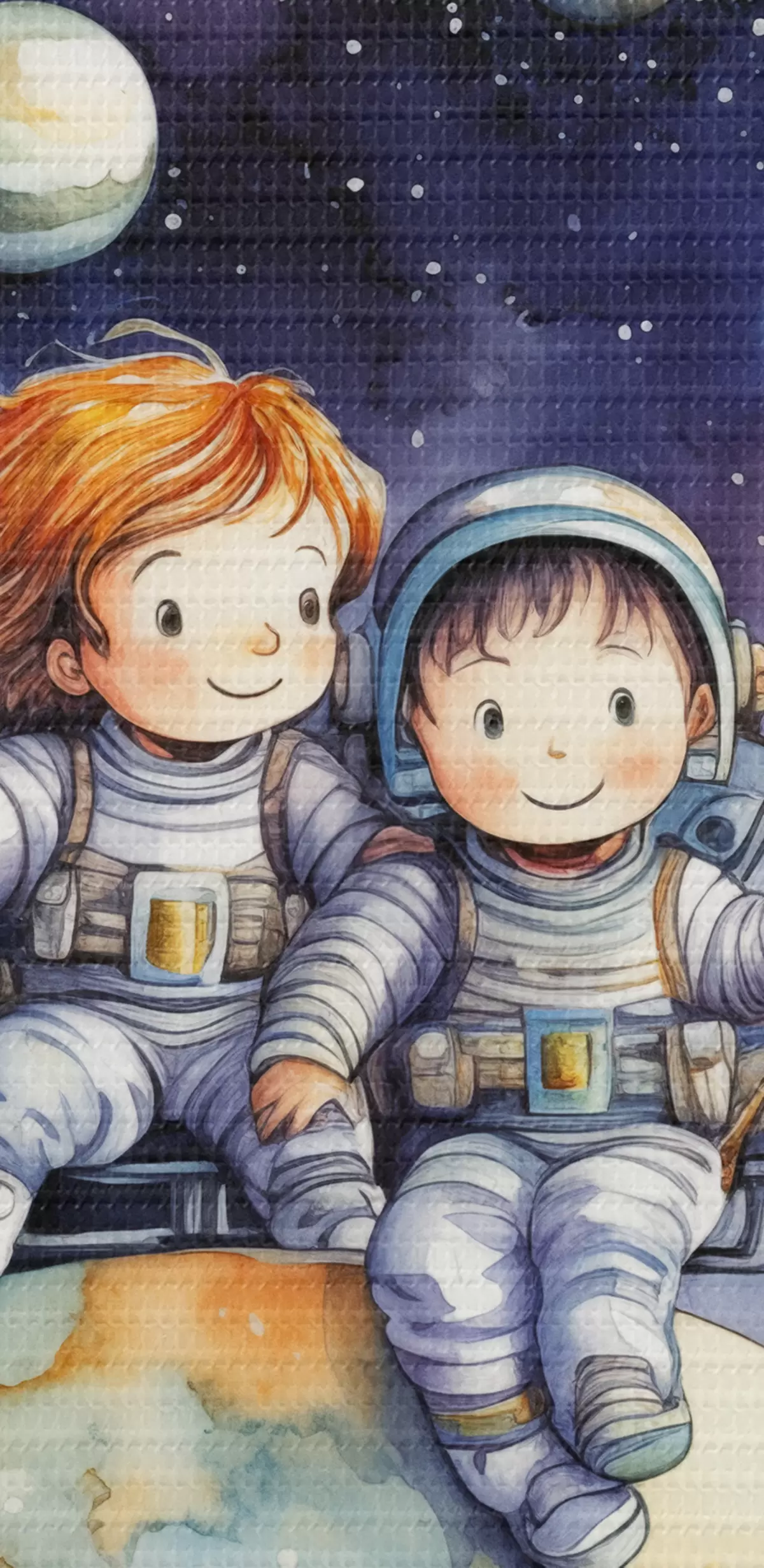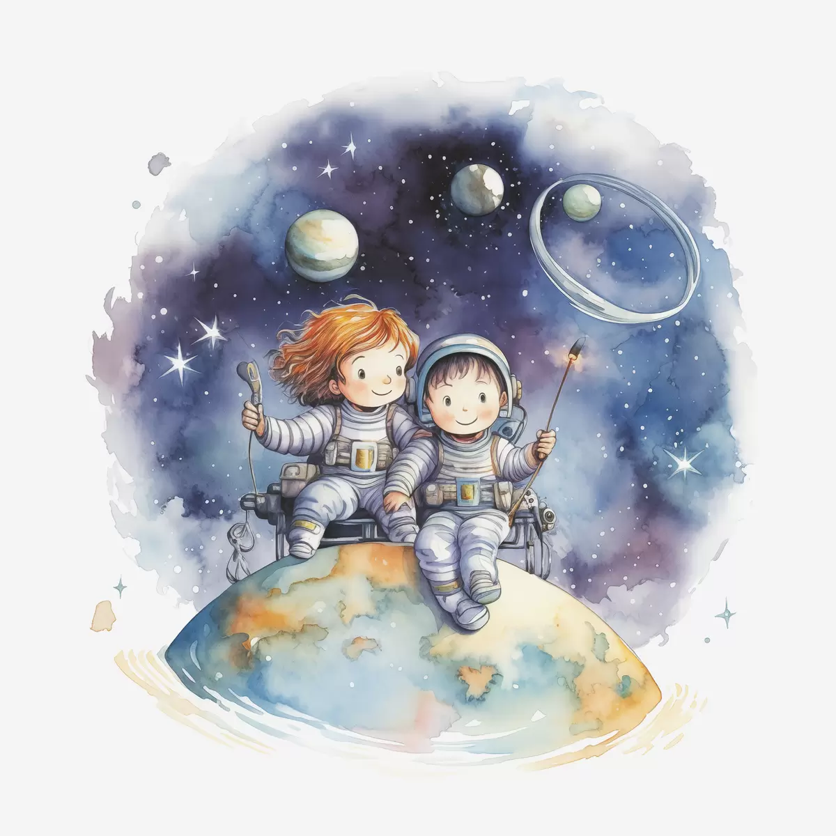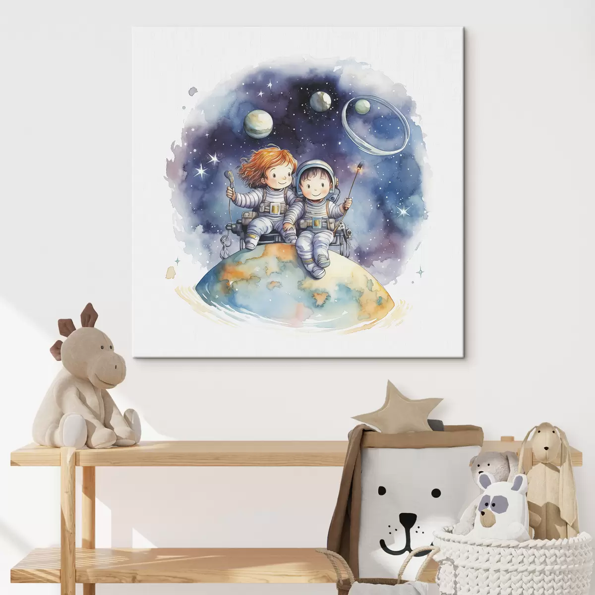 Quadri Bambini in tute spaziali seduti su un pianeta nello spazio illustrazione ad acquerello per bambini Nr s39117