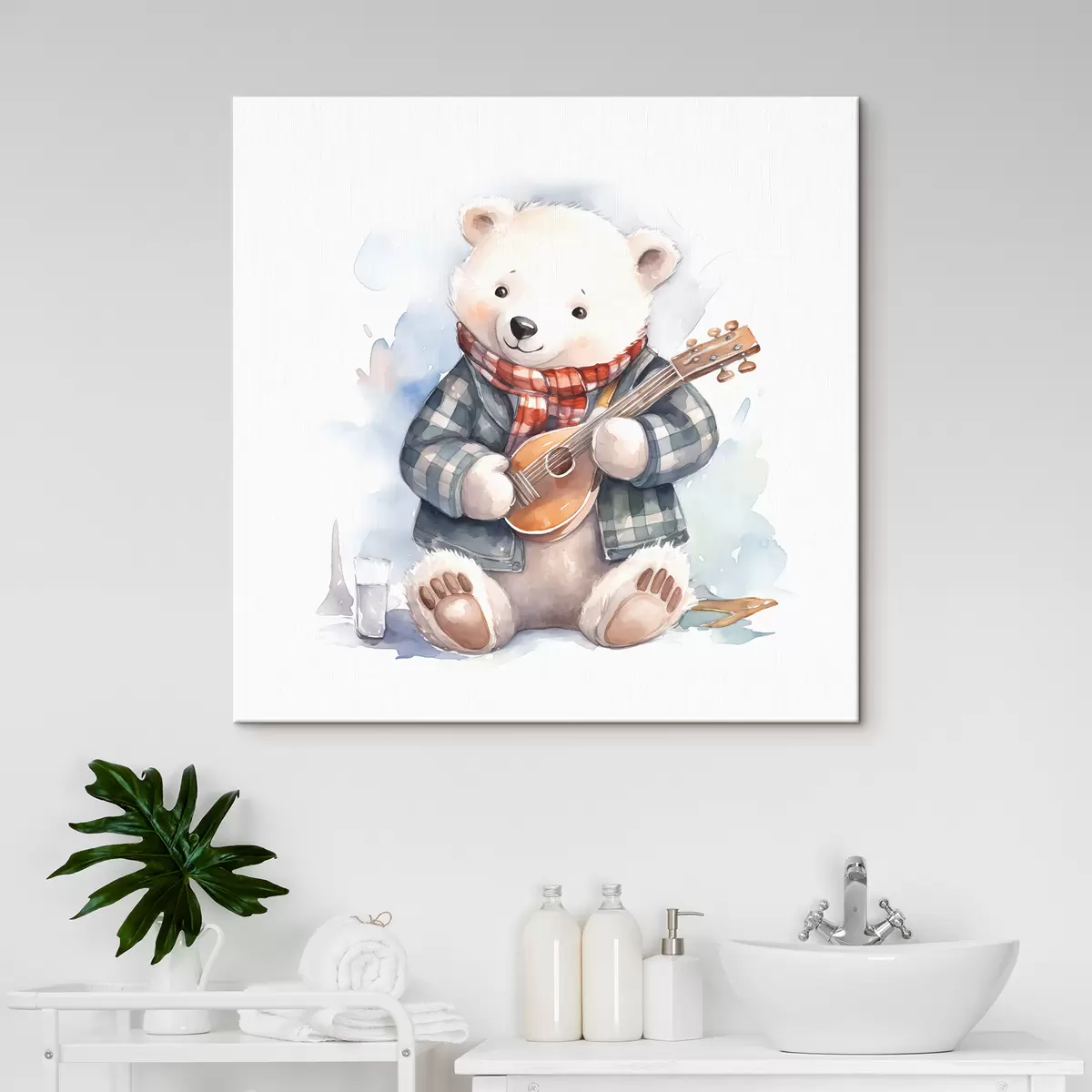 Quadri Il musicista dell'orso polare in un vestito a quadretti blu e una sciarpa rossa suona l'illustrazione dell'acquerello dei bambini della chitarra Nr s39120