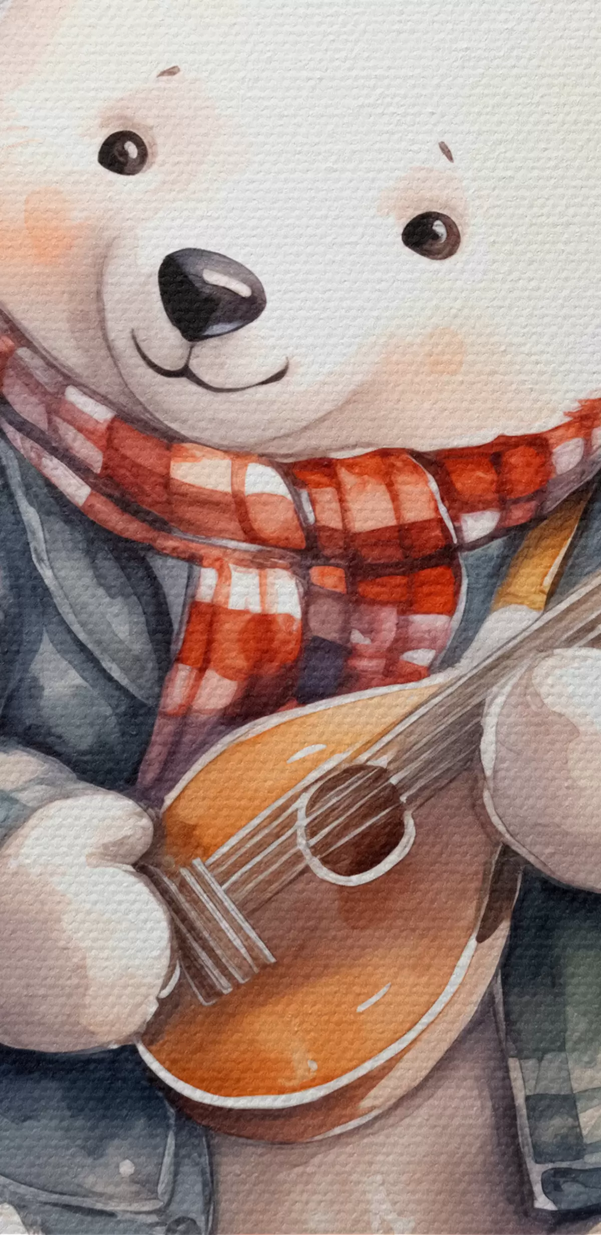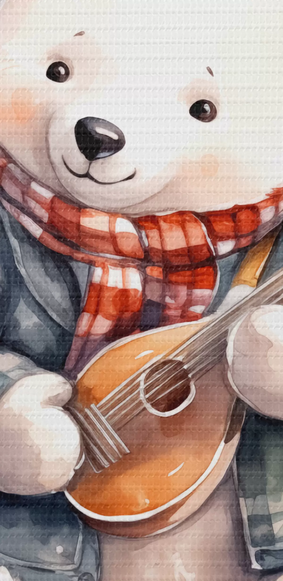 carta da parati Il musicista dell'orso polare in un vestito a quadretti blu e una sciarpa rossa suona l'illustrazione dell'acquerello dei bambini della chitarra nr. s39120