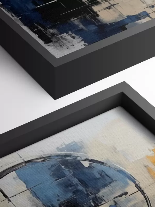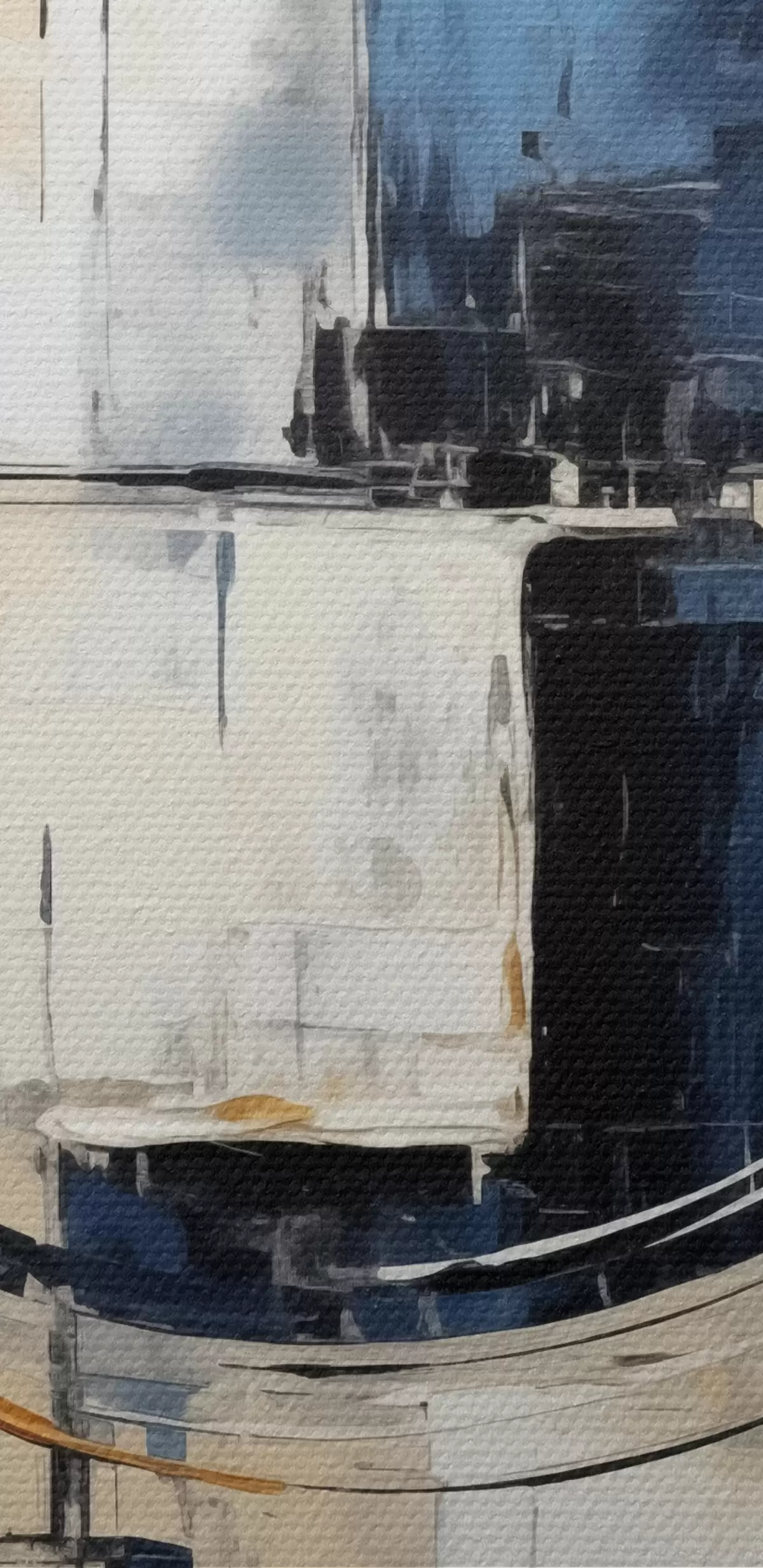 Quadri Cubismo astratto, tratti blu, arancioni, bianchi, figura circolare Nr s39179