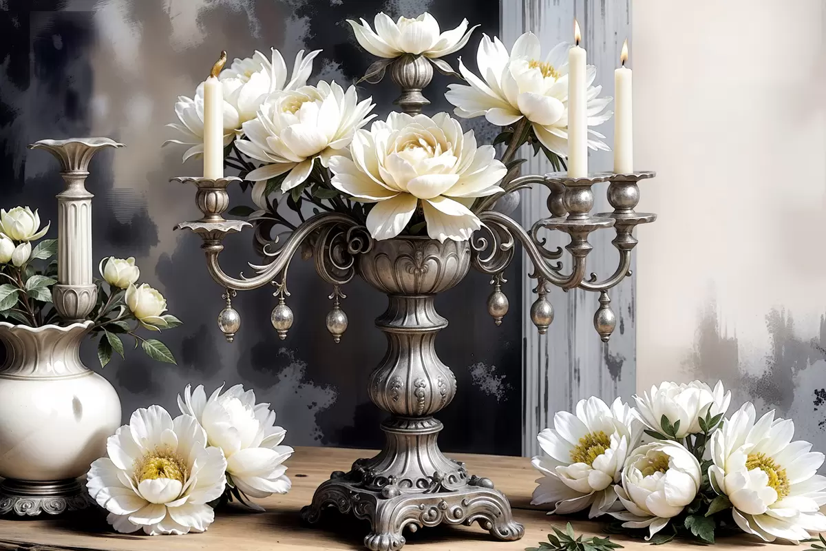 carta da parati Un bouquet di grandi fiori bianchi di dalia in un vaso d'argento ornato, circondato da candele accese su un tavolo di legno nr. s39384