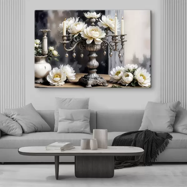 Quadri Un bouquet di grandi fiori bianchi di dalia in un vaso d'argento ornato, circondato da candele accese su un tavolo di legno Nr s39384
