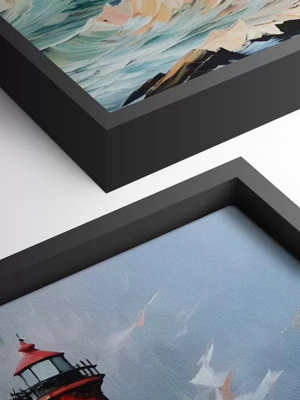Quadri Dipinto di un faro rosso che si erge su una scogliera rocciosa, circondato da onde che si infrangono e da un cielo tempestoso Nr s39392