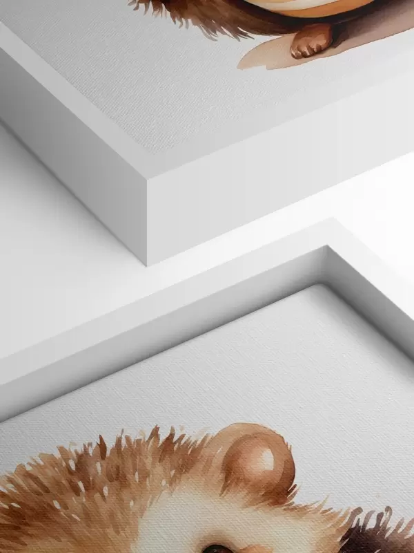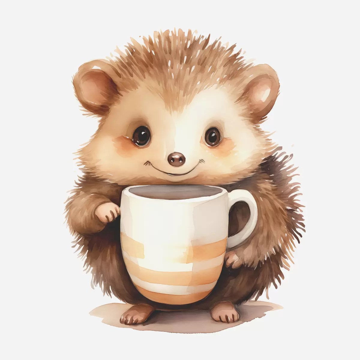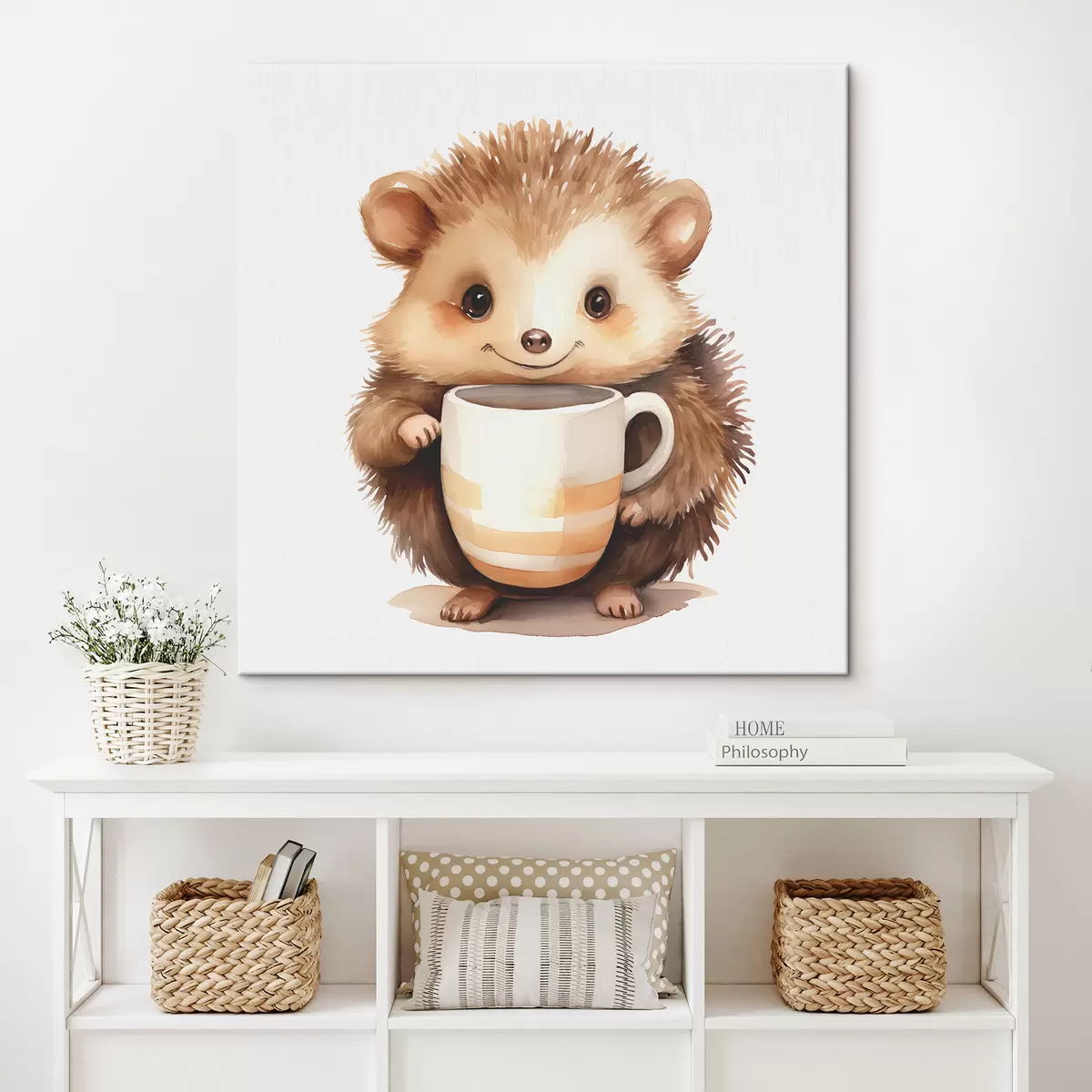 Quadri Riccio che tiene una tazza bianca nelle zampe illustrazione per bambini ad acquerello Nr s39440