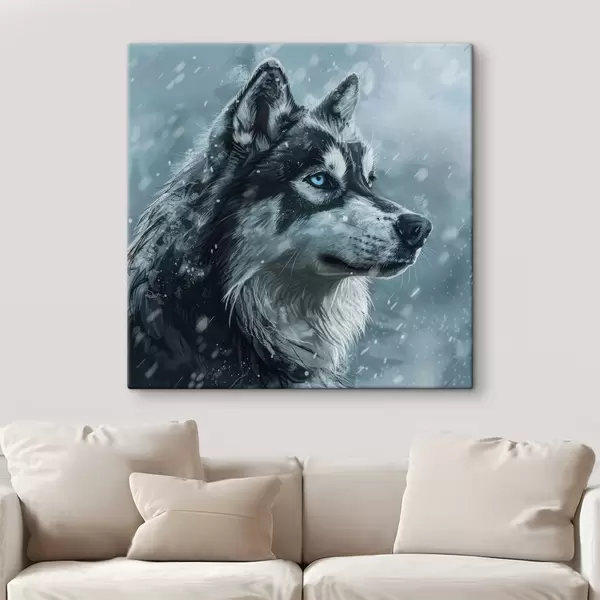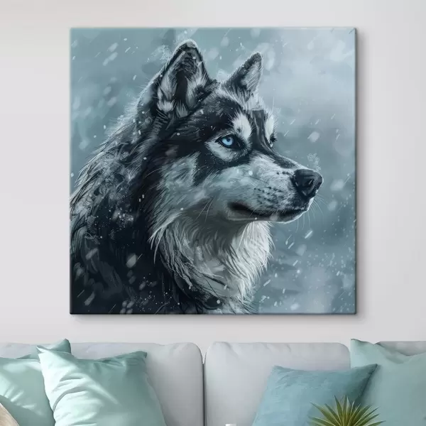Quadri Husky con gli occhi azzurri su sfondo blu invernale Nr s39462