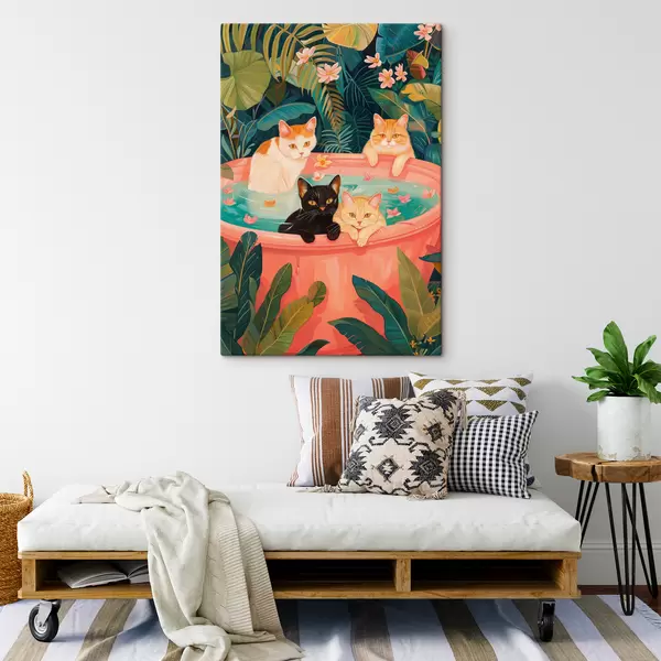 Quadri Gatti in un bagno rosa con foglie verdi, atmosfera da giungla Nr s39465