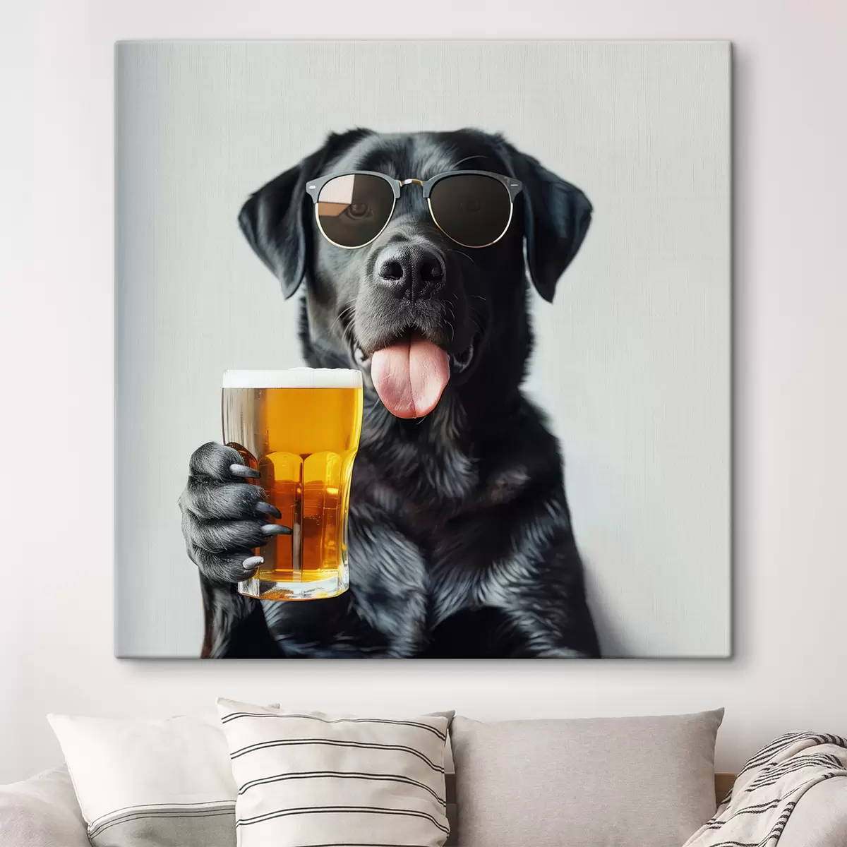 Quadri Ritratto di un labrador nero che indossa occhiali da sole e tiene in mano una pinta di birra, guardando dritto nella telecamera Nr s39470