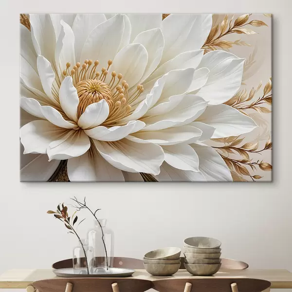 Quadri Un primo piano di un grande fiore bianco della dalia con petali delicati e un centro giallo vibrante Nr s39508