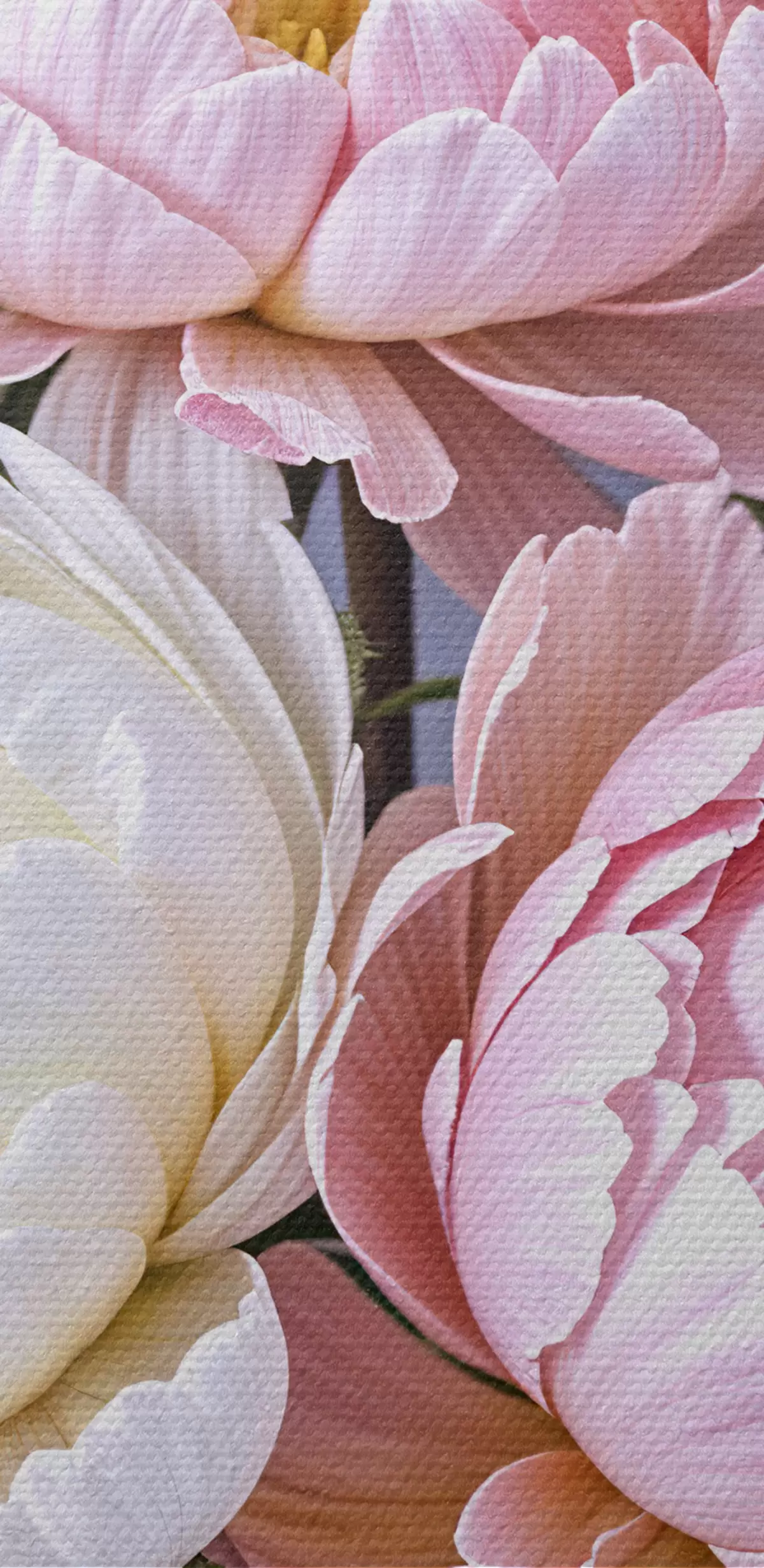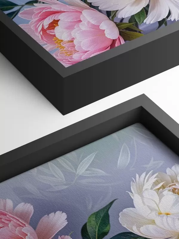 Quadri Un bouquet di grandi e rigogliosi fiori di peonia rosa e bianca con foglie verdi su uno sfondo morbido e sfocato Nr s39514