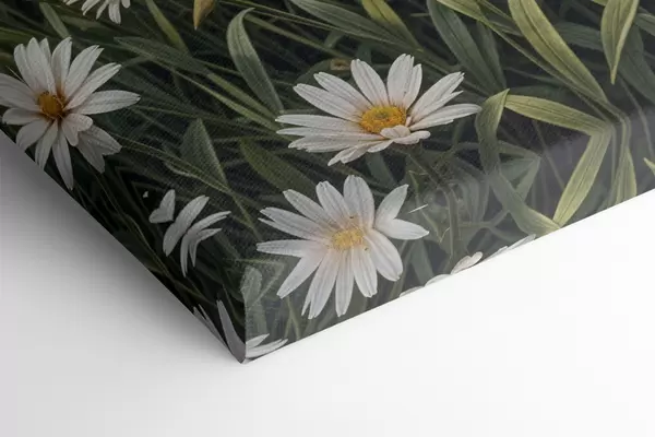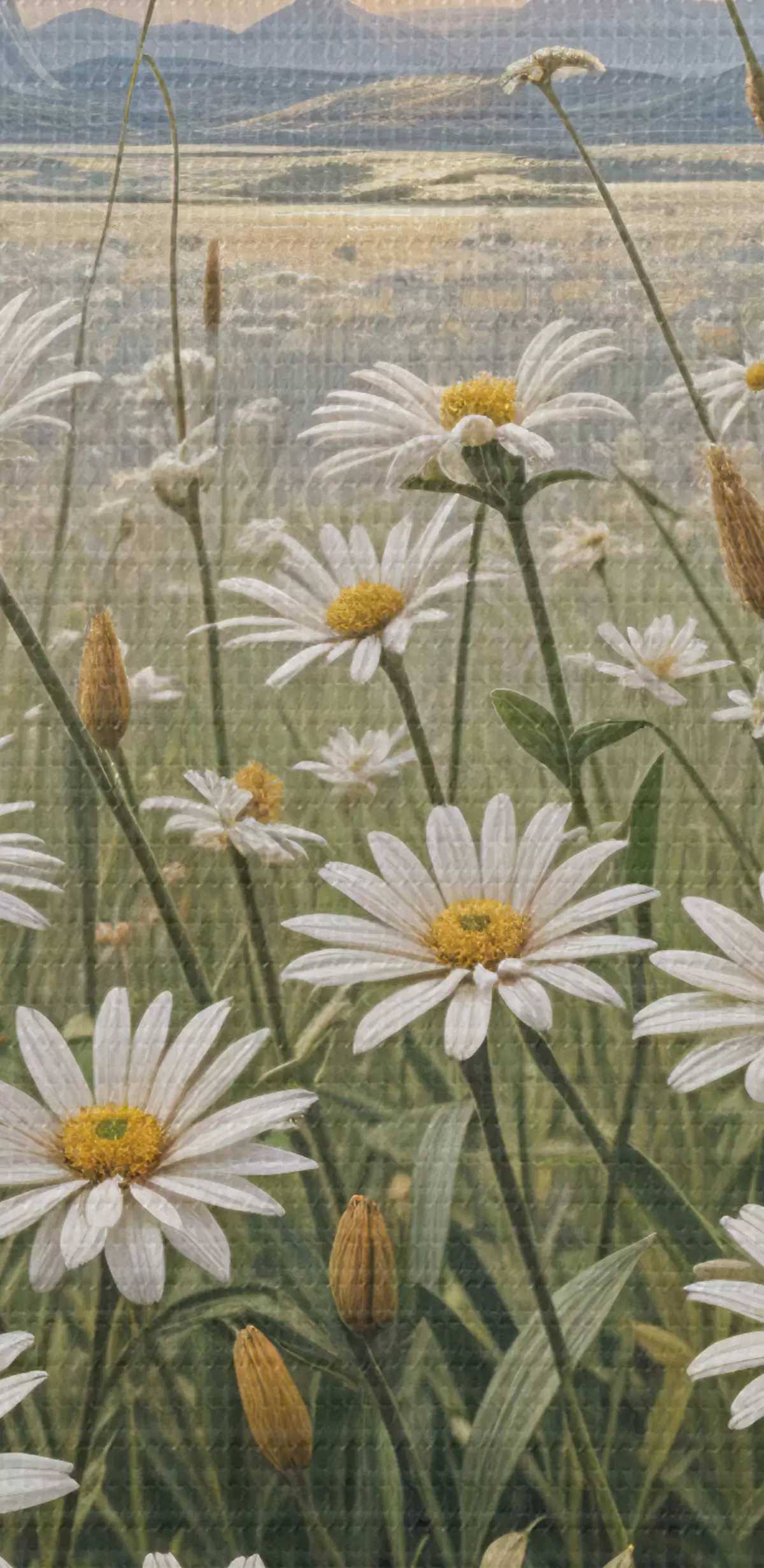 Quadri Un campo di fiori bianchi a margherita in primo piano con un paesaggio di montagne e un cielo nuvoloso Nr s39528