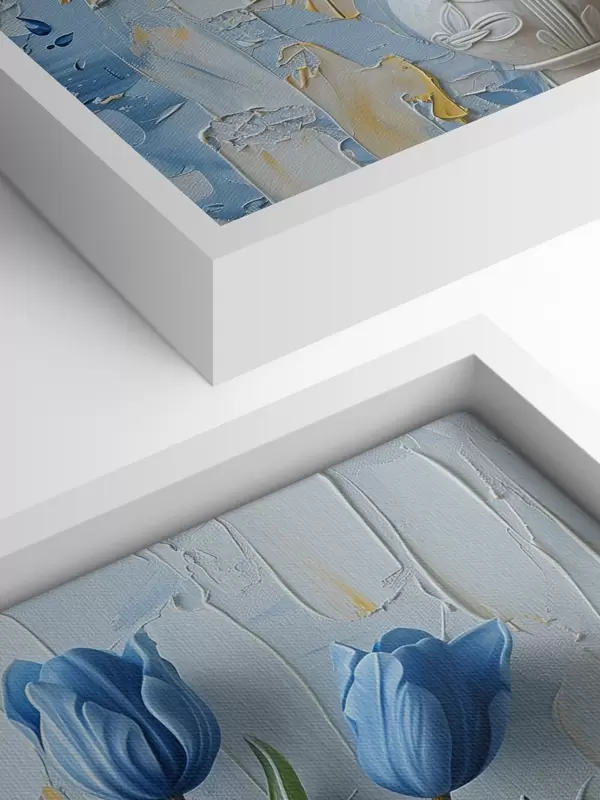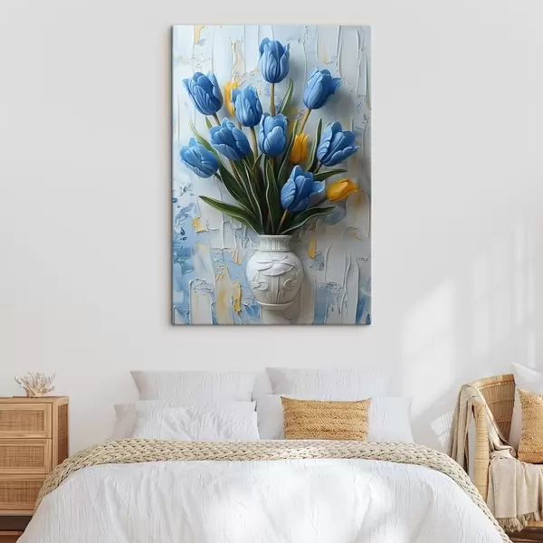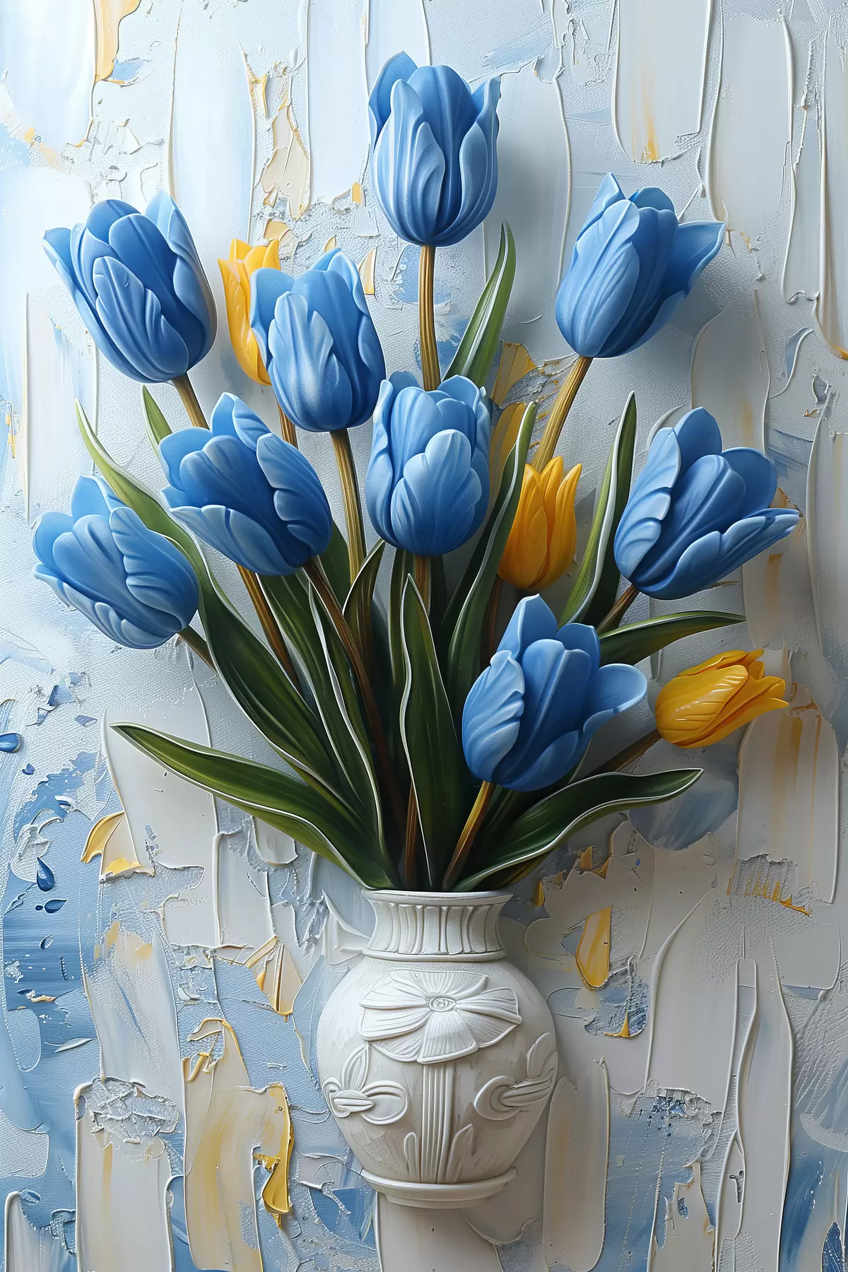 Quadri Tulipani blu e gialli in 3D: elegante quadro da parete dipinto ad olio con fondo bianco e azzurro e vaso inciso Nr s39637