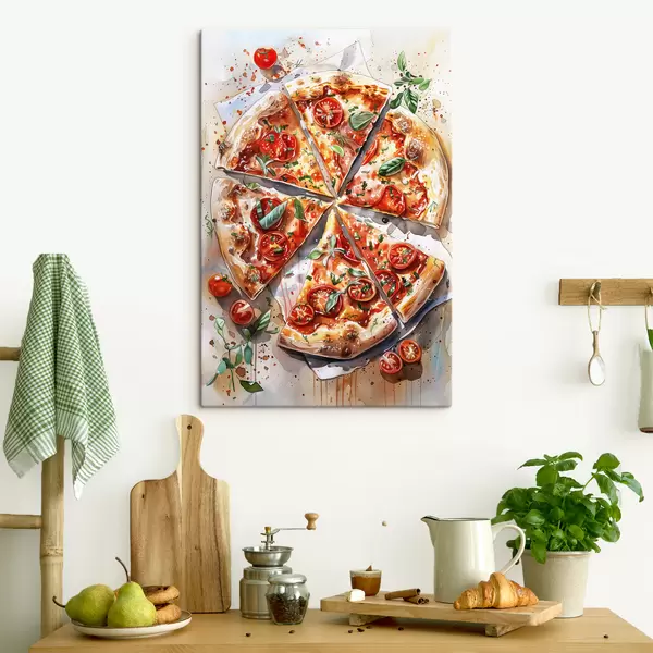 Quadri Pizza acquerello, deliziosa, pomodori e formaggio, arte alimentare, tavolo in legno Nr s39704