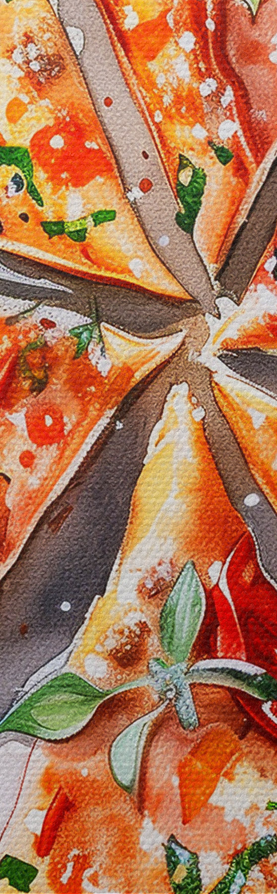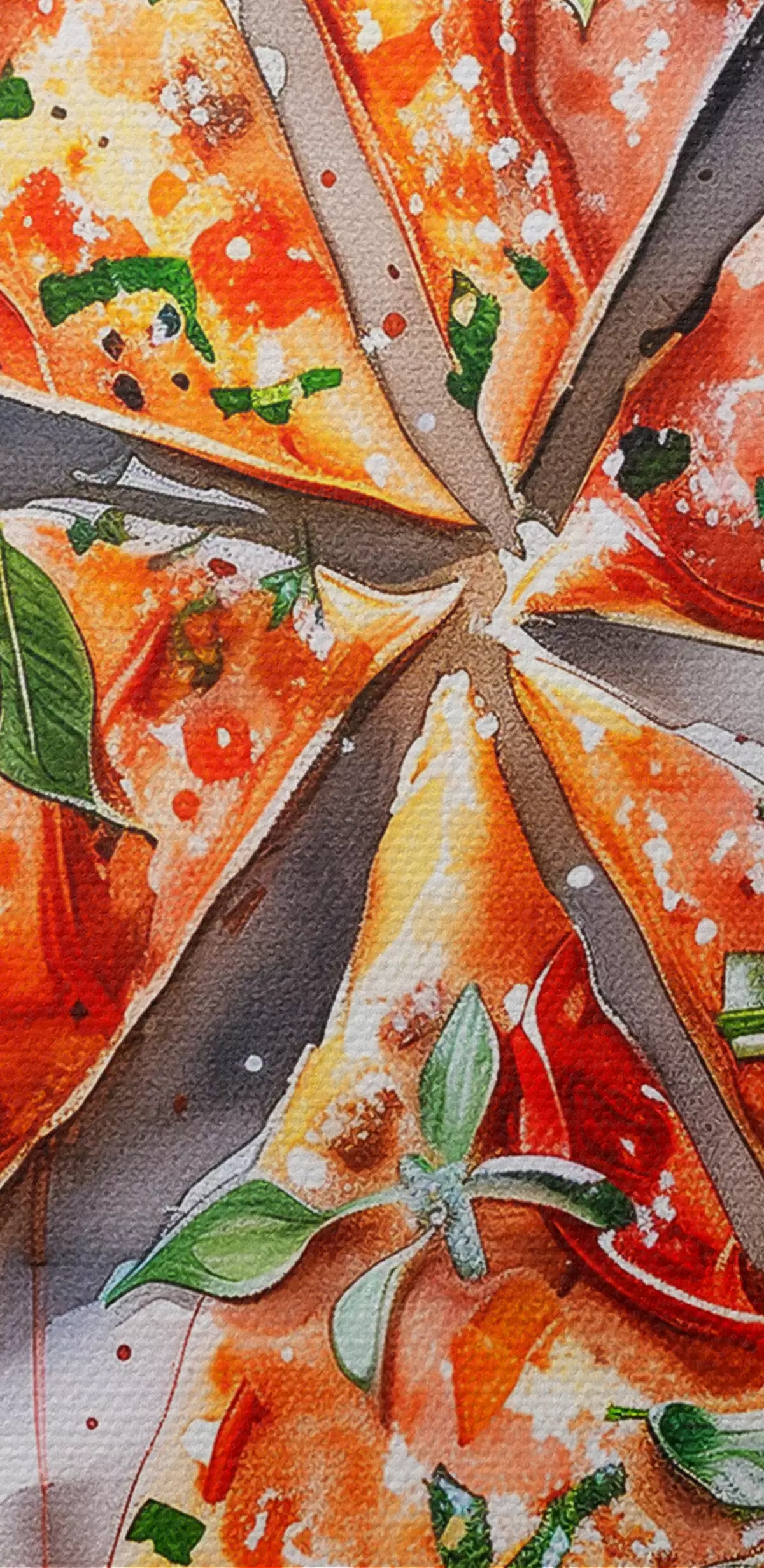 carta da parati Pizza acquerello, deliziosa, pomodori e formaggio, arte alimentare, tavolo in legno nr. s39704