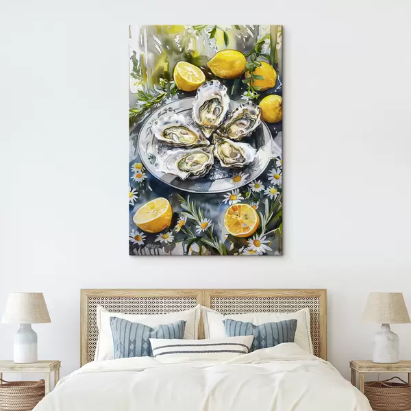 Quadri Ostriche eleganti nel piatto, limoni e fiori, colori estivi, mediterranei Nr s39710