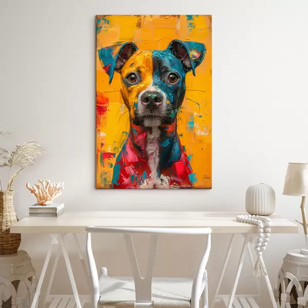 Quadri Ritratto di un Pitbull con pennellate di olio giallo e blu Nr s39722