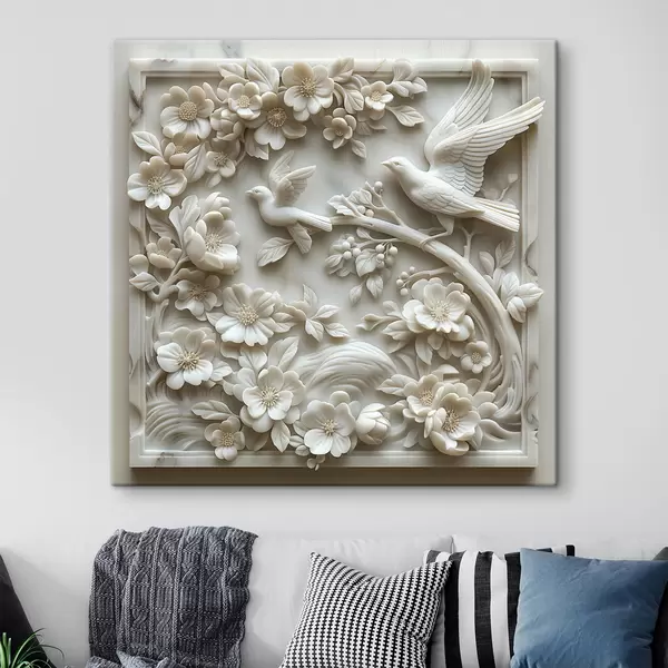 carta da parati Giardino in marmo bianco con bassorilievo di uccelli e fiori  nr. s39728