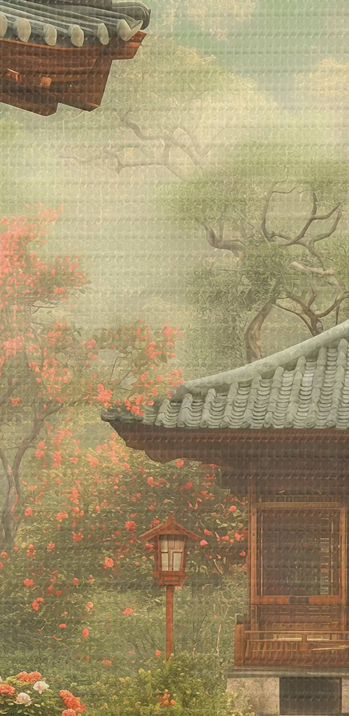 carta da parati Parco giapponese con alberi e fiori in fiore, foresta, casa in legno nr. s39773