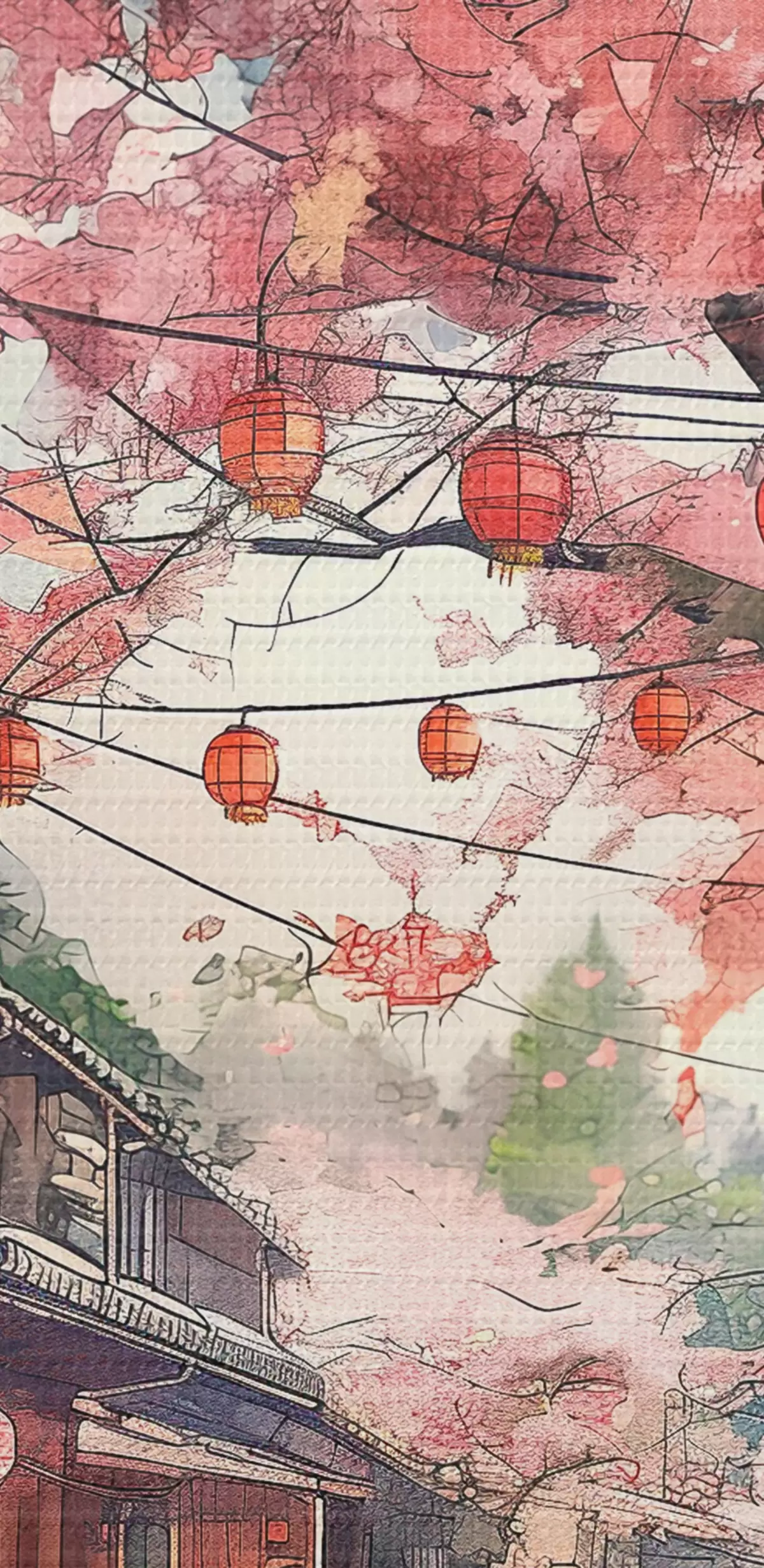 carta da parati Strada giapponese con ciliegi in fiore, architettura orientale, lanterne nr. s39774