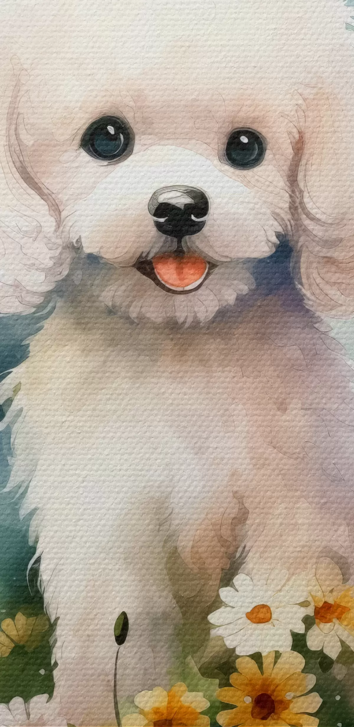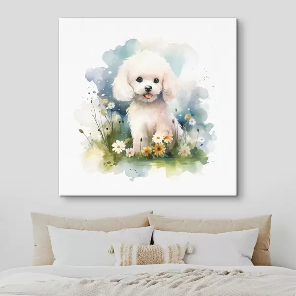 Quadri Piccolo barboncino bianco seduto tra i fiori acquerello Nr s39928
