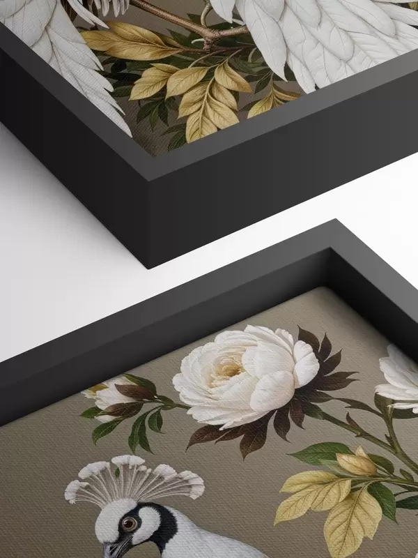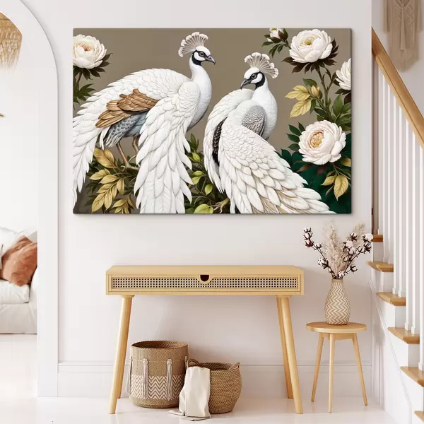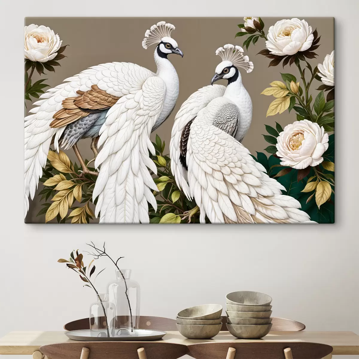 Quadri Due pavoni bianchi con piume ornate appollaiati su un ramo con fiori Nr s40022