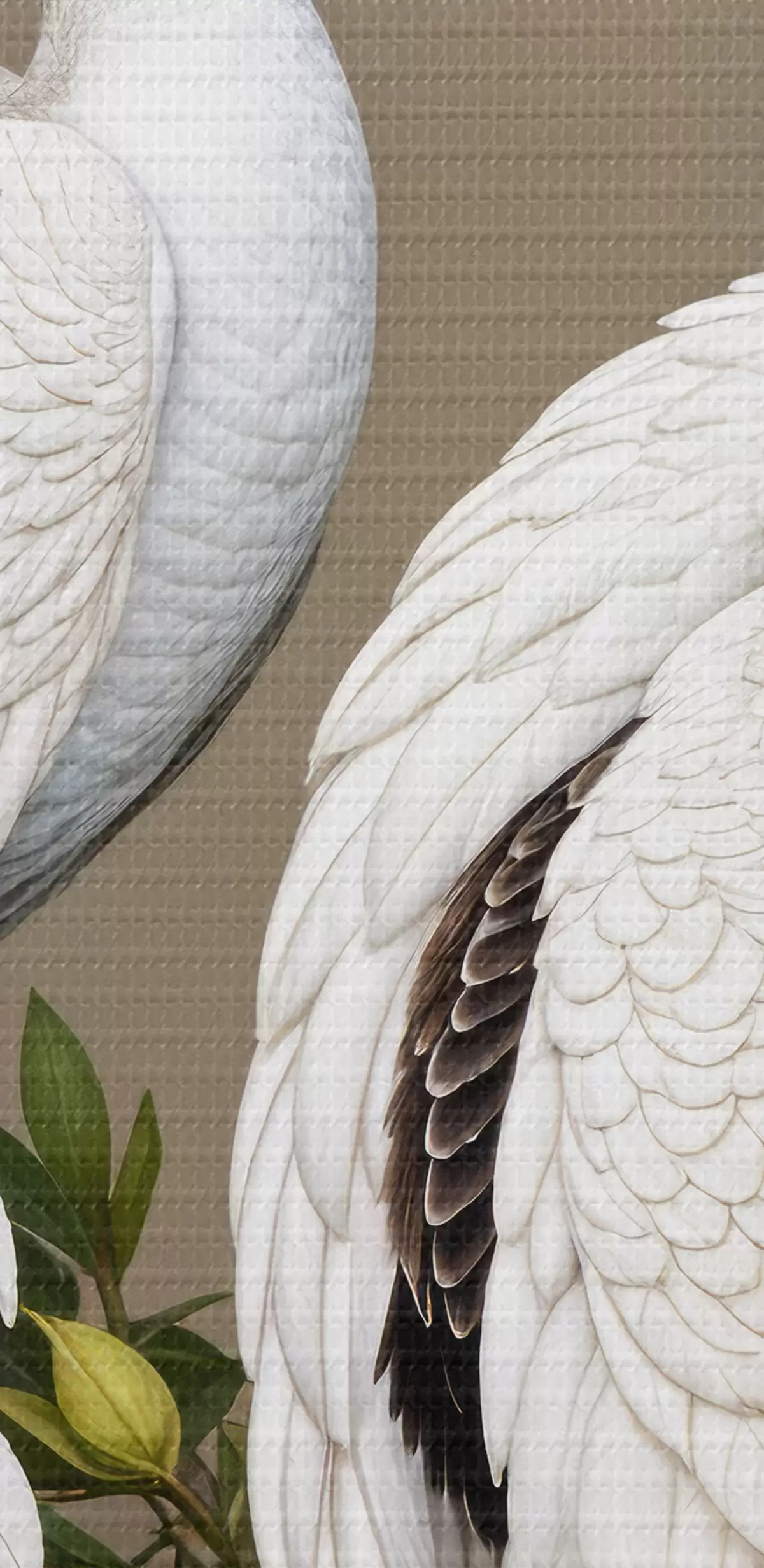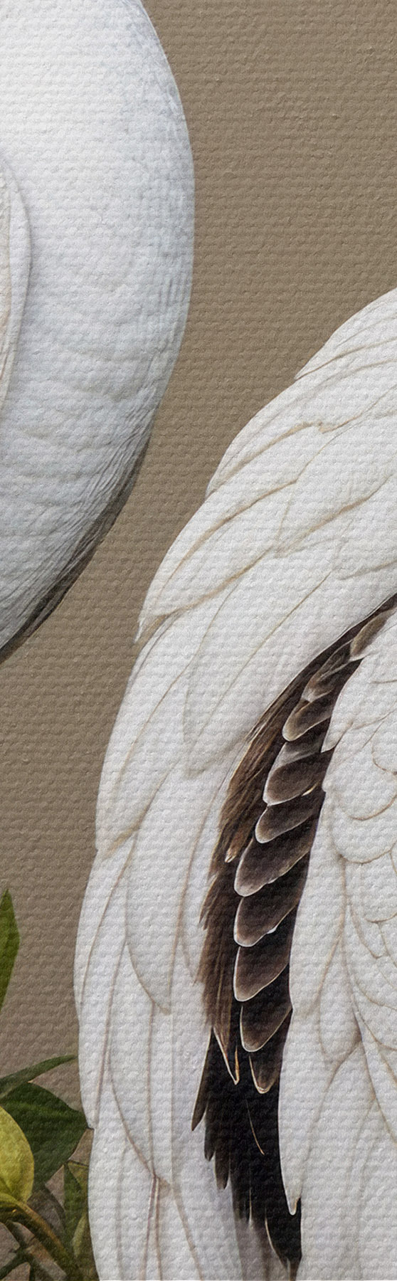carta da parati Due pavoni bianchi con piume ornate appollaiati su un ramo con fiori nr. s40022