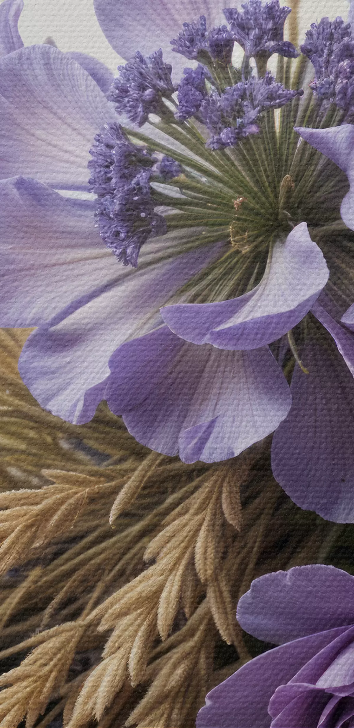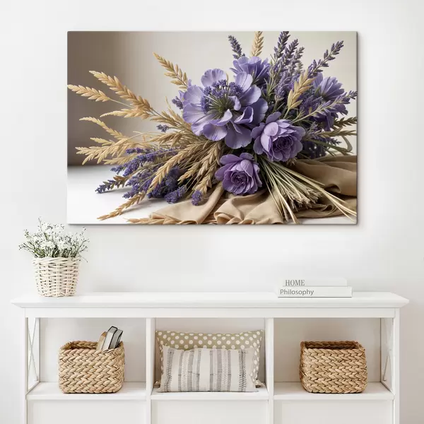 Quadri Un bouquet di fiori viola, tra cui peonie e lavanda, con steli di grano su uno sfondo chiaro Nr s40030