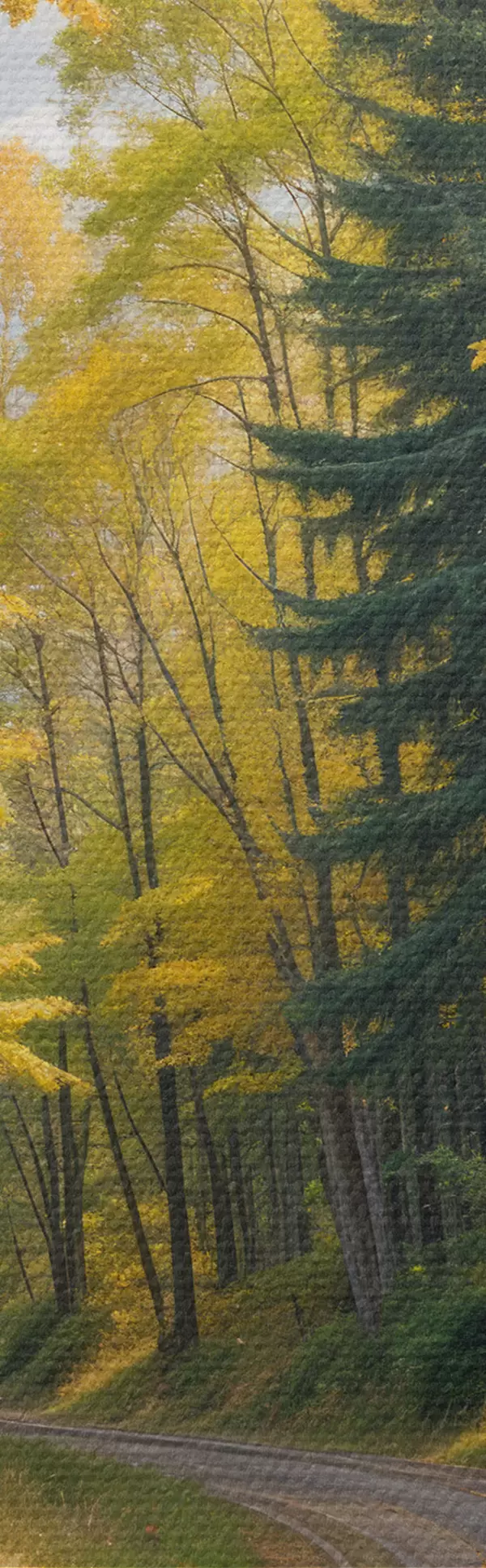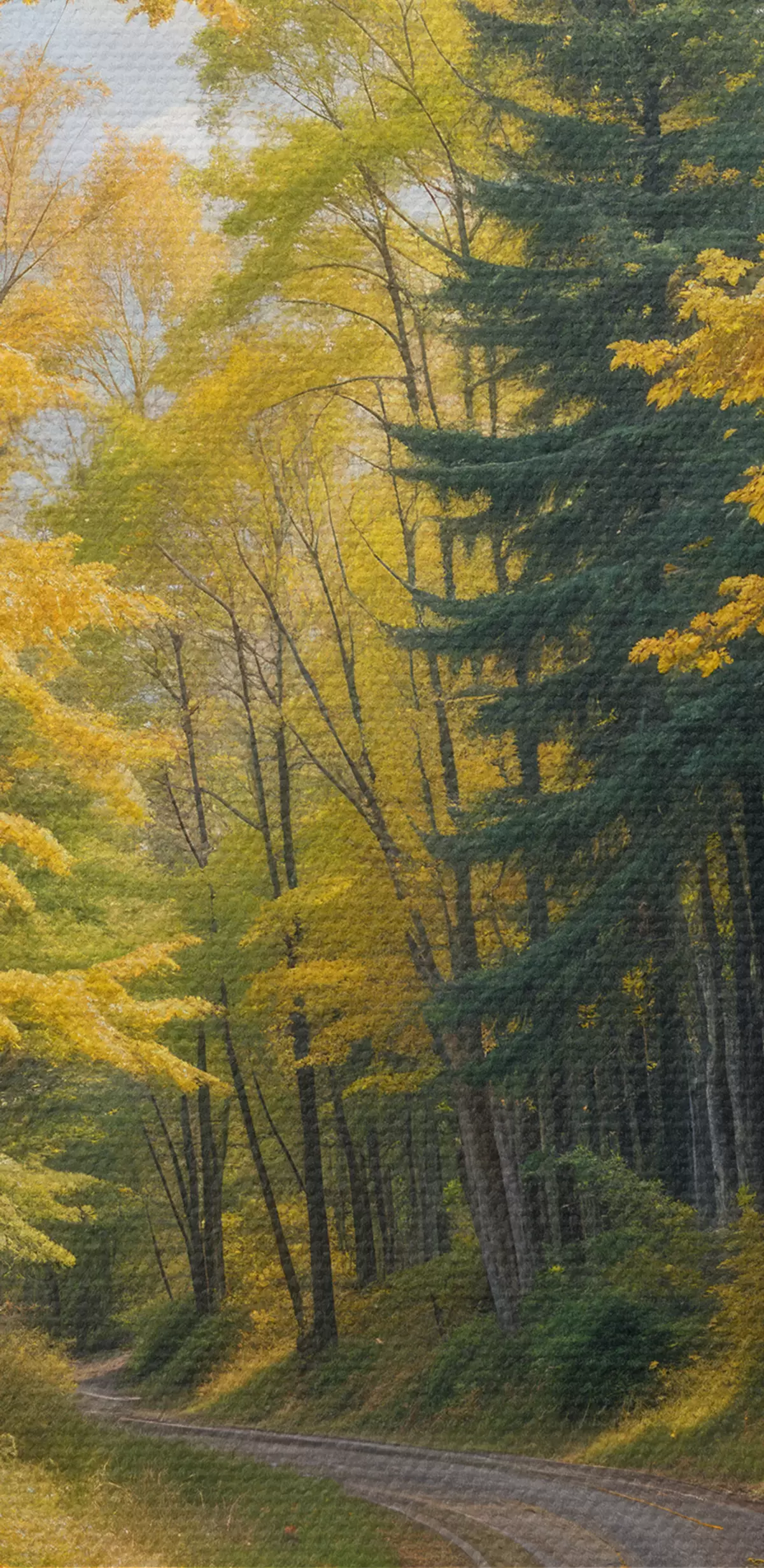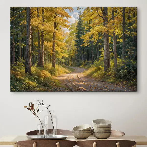 Quadri Una strada sterrata che serpeggia attraverso una foresta in autunno, con alberi alti su entrambi i lati Nr s40031