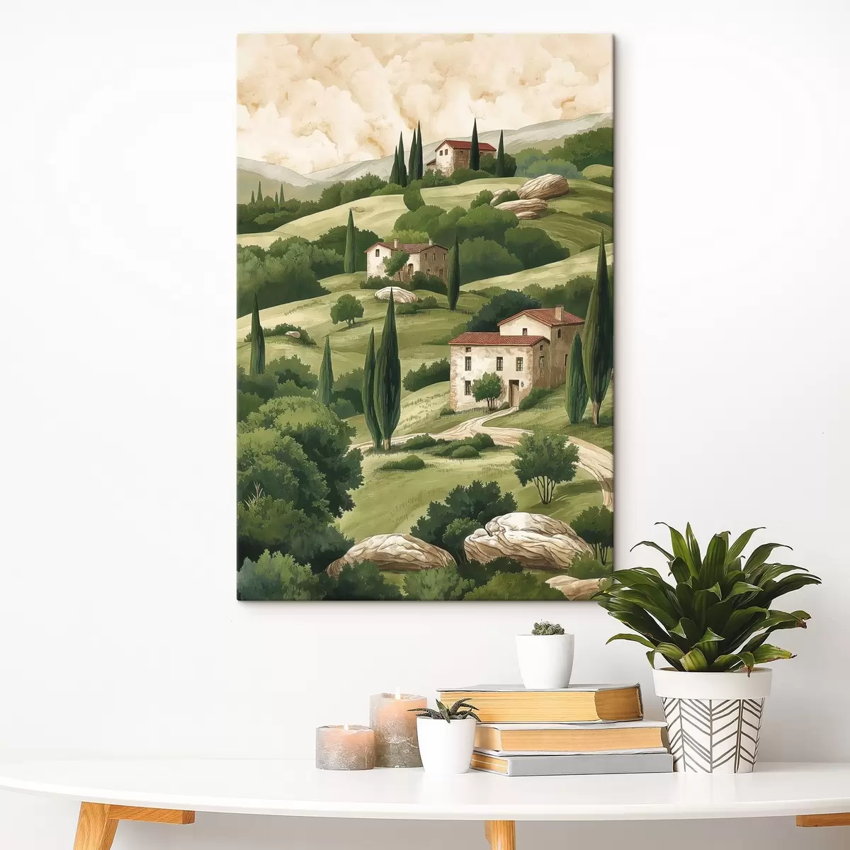 Quadri Paesaggio con case d'epoca, colori verde pastello, disegno acrilico, rustico Nr s40080