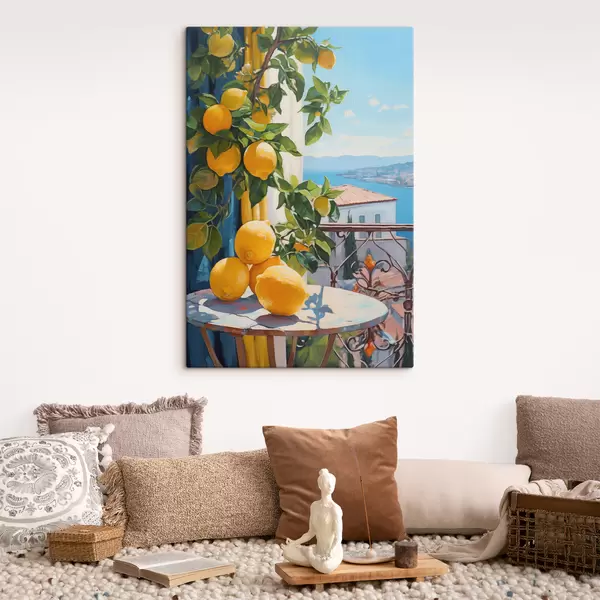 Quadri Limoni su albero e tavolo sul balcone dell'hotel con vista mare imitazione pittura a olio Nr s40091