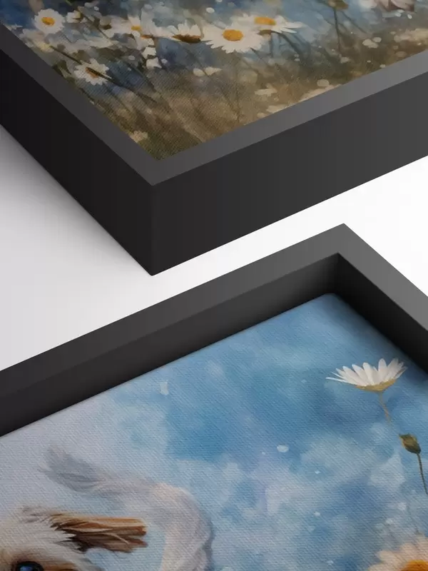 Quadri Piccolo cane bianco che salta tra le margherite su uno sfondo blu acquerello Nr s40092