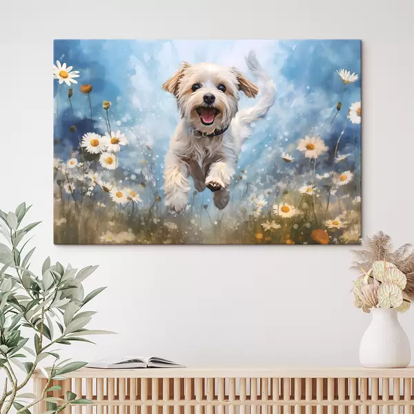Quadri Piccolo cane bianco che salta tra le margherite su uno sfondo blu acquerello Nr s40092