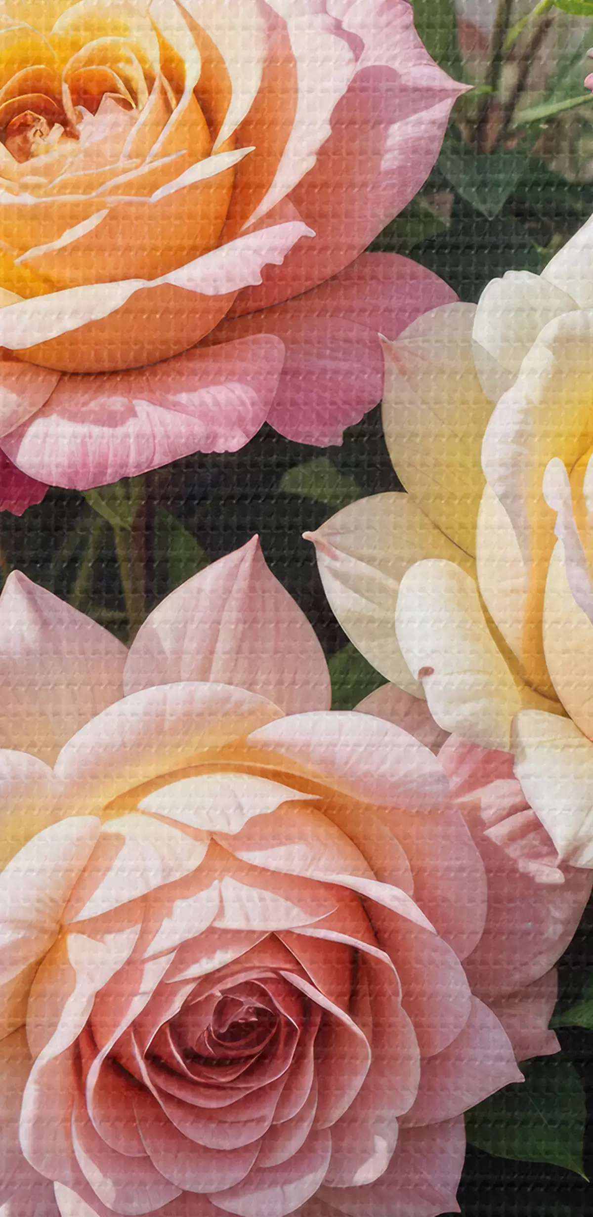 Quadri Un bouquet di rose colorate in varie tonalità di rosa, giallo e arancione, disposte con foglie verdi Nr s40149