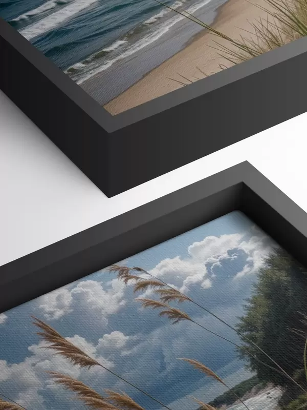 Quadri Una spiaggia panoramica con erba alta che ondeggia al vento, con vista sull'oceano con onde che si infrangono e un cielo nuvoloso Nr s40161