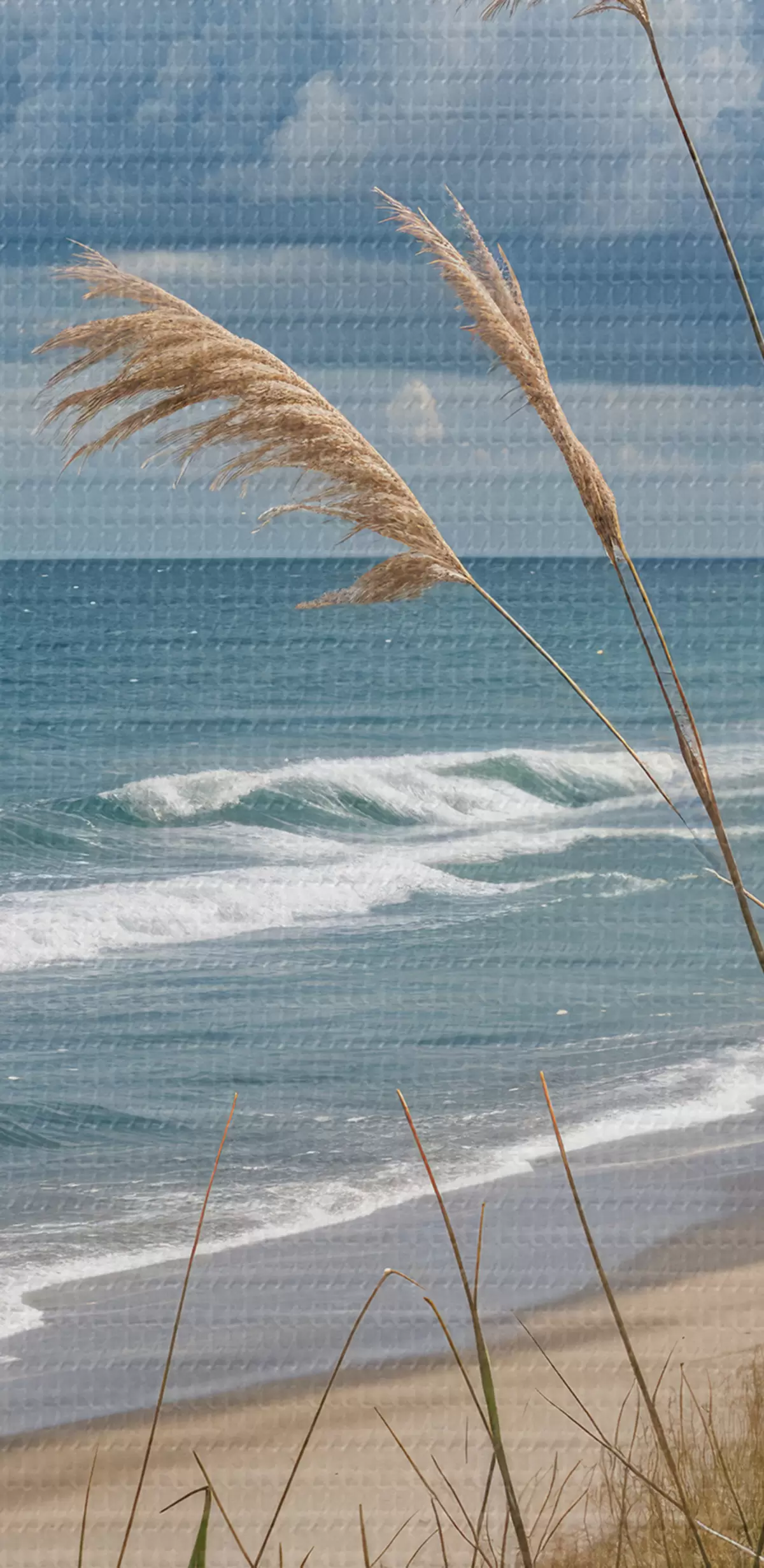 Quadri Una spiaggia panoramica con erba alta che ondeggia al vento, con vista sull'oceano con onde che si infrangono e un cielo nuvoloso Nr s40161