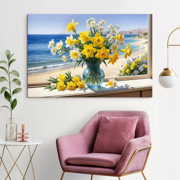 Quadri Un mazzo di narcisi gialli e margherite bianche in un vaso di vetro su un davanzale con vista sulla spiaggia e sull'oceano Nr s40171