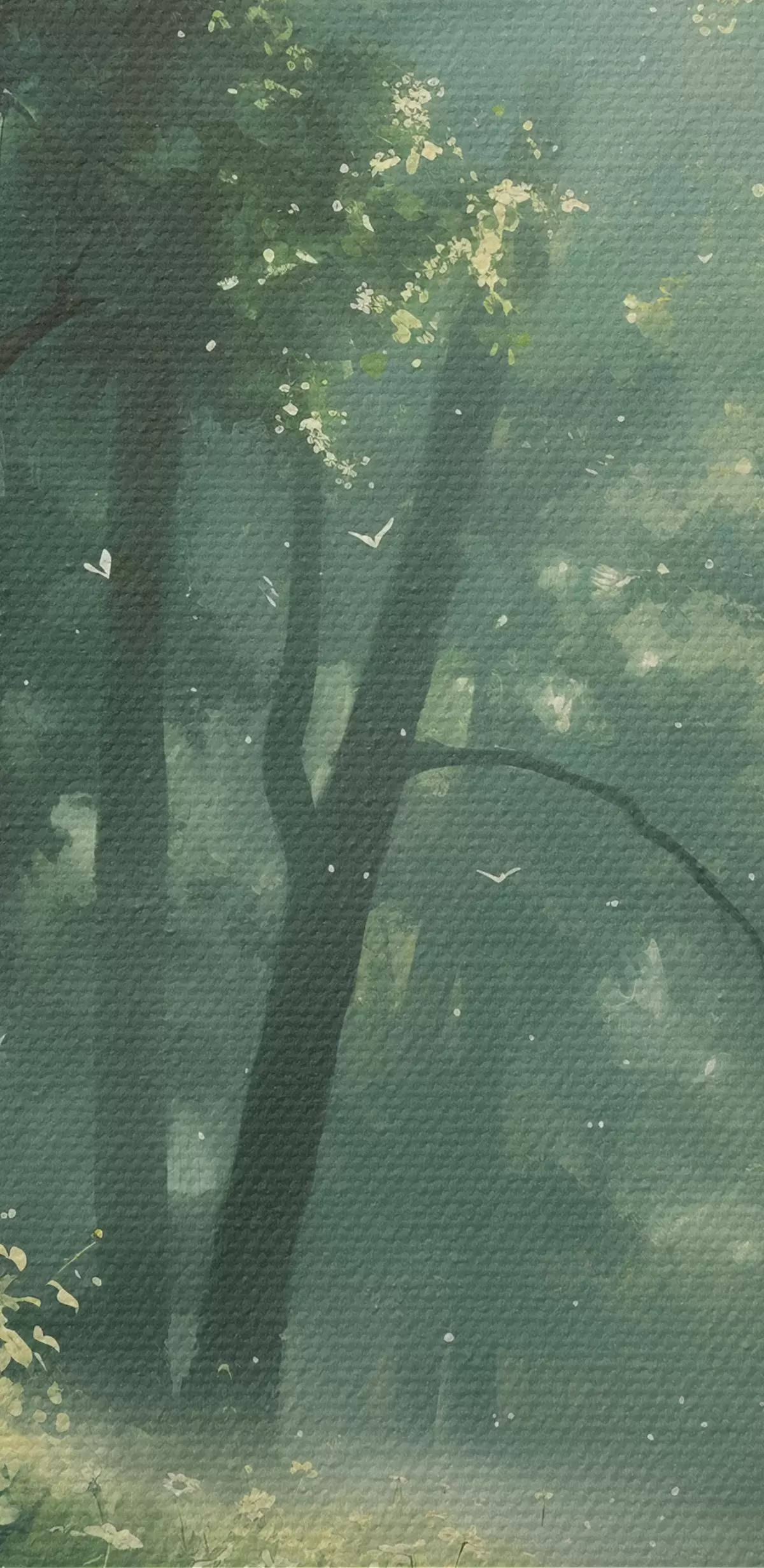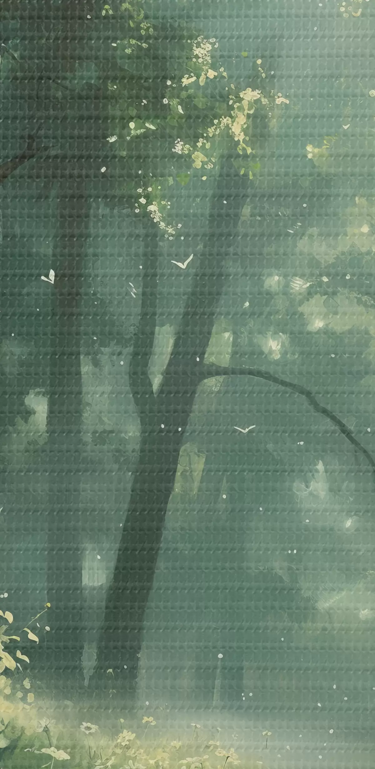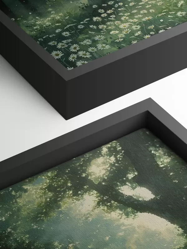 Quadri Foresta fitta con luce solare sugli alberi, fiori di camomilla, erba verde, natura Nr s40224
