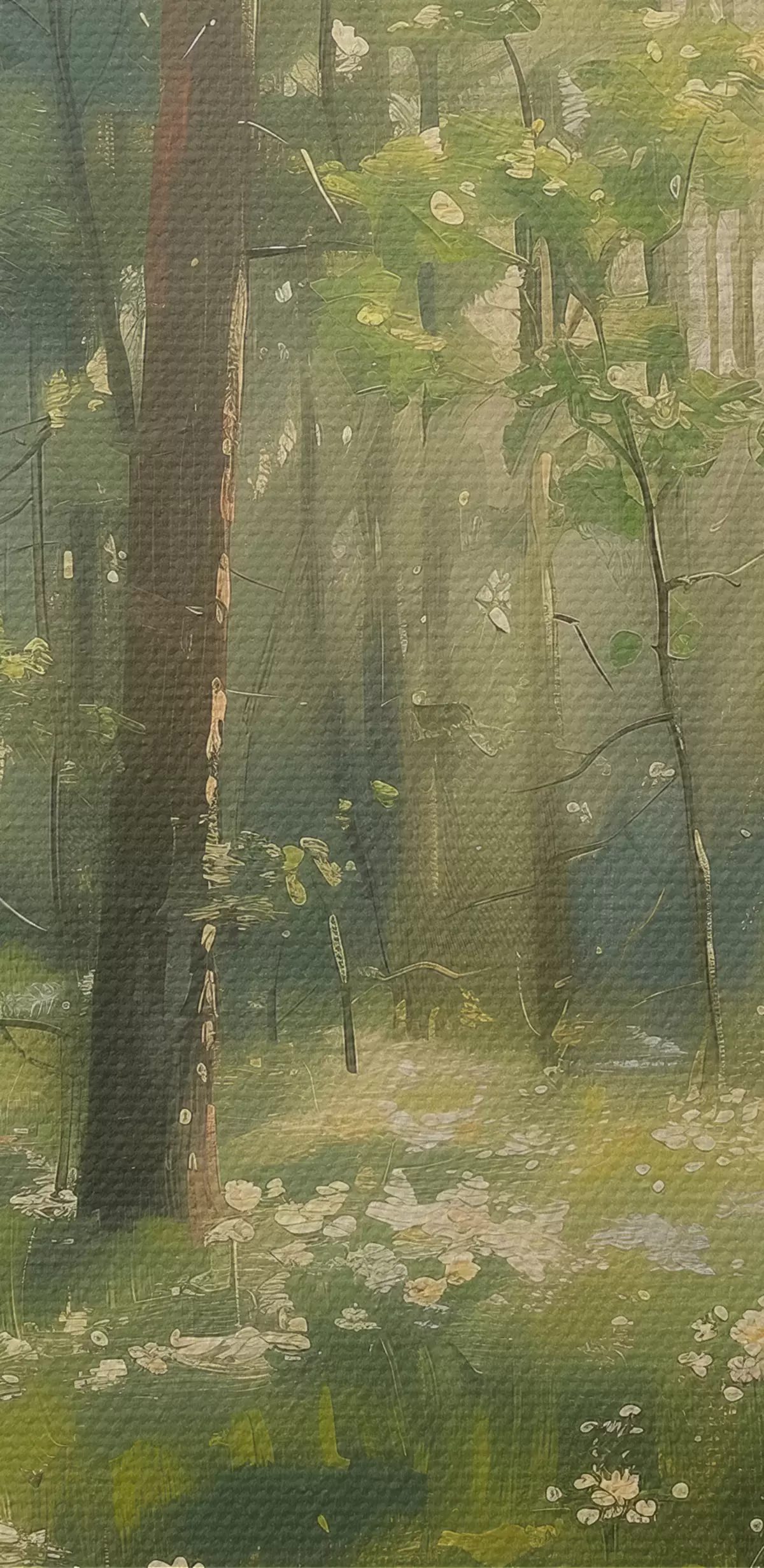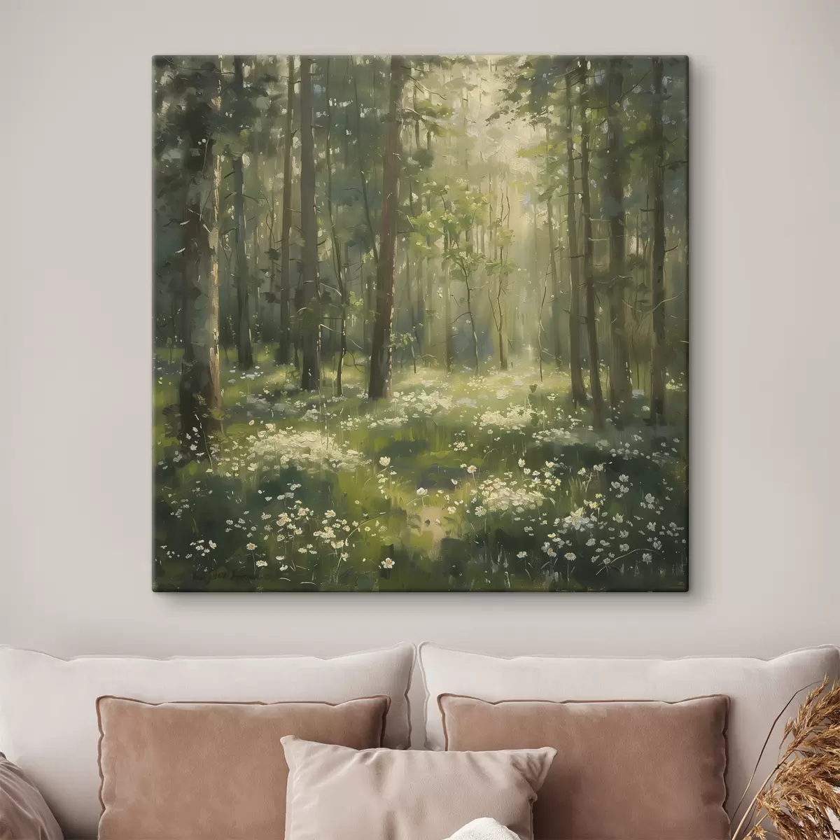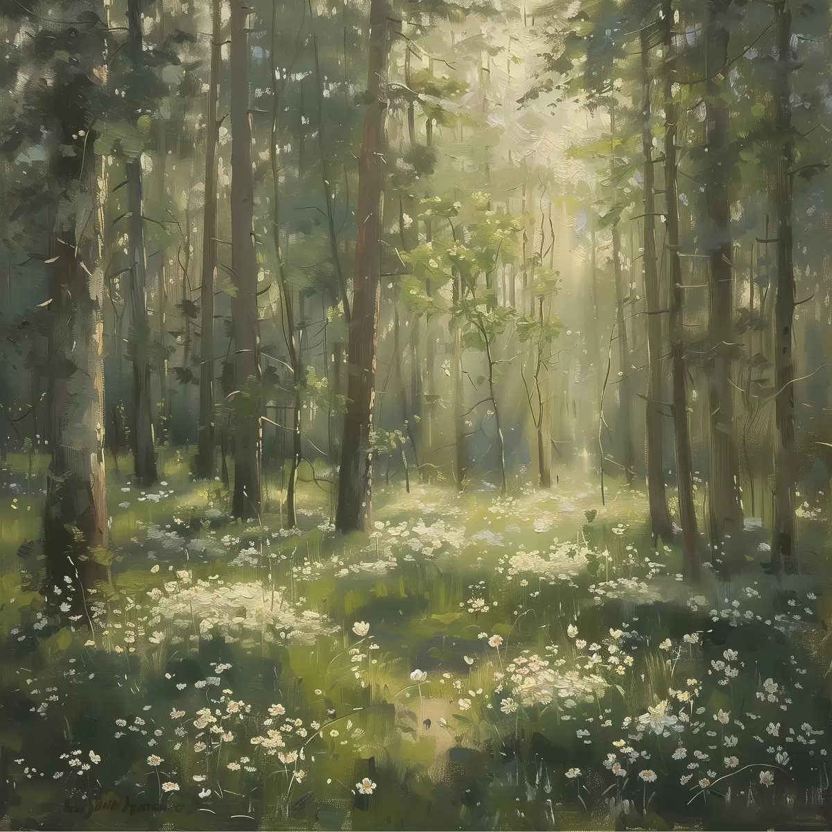 Quadri Foresta con luce solare sugli alberi, fiori di camomilla, erba verde, disegno acrilico Nr s40226