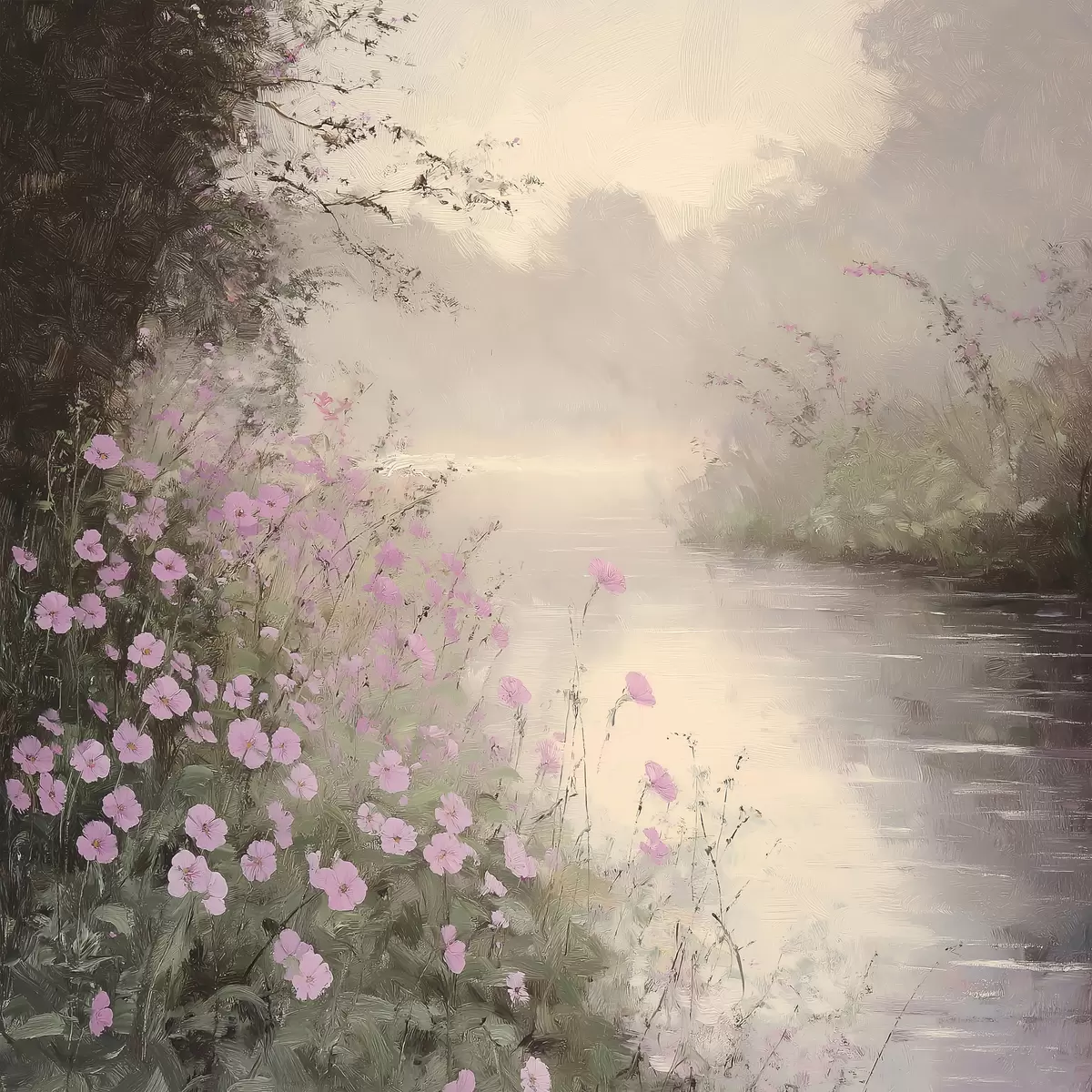 Quadri Lago con fiori rosa, alba, disegno a olio, colori beige pastello, nebbia Nr s40229