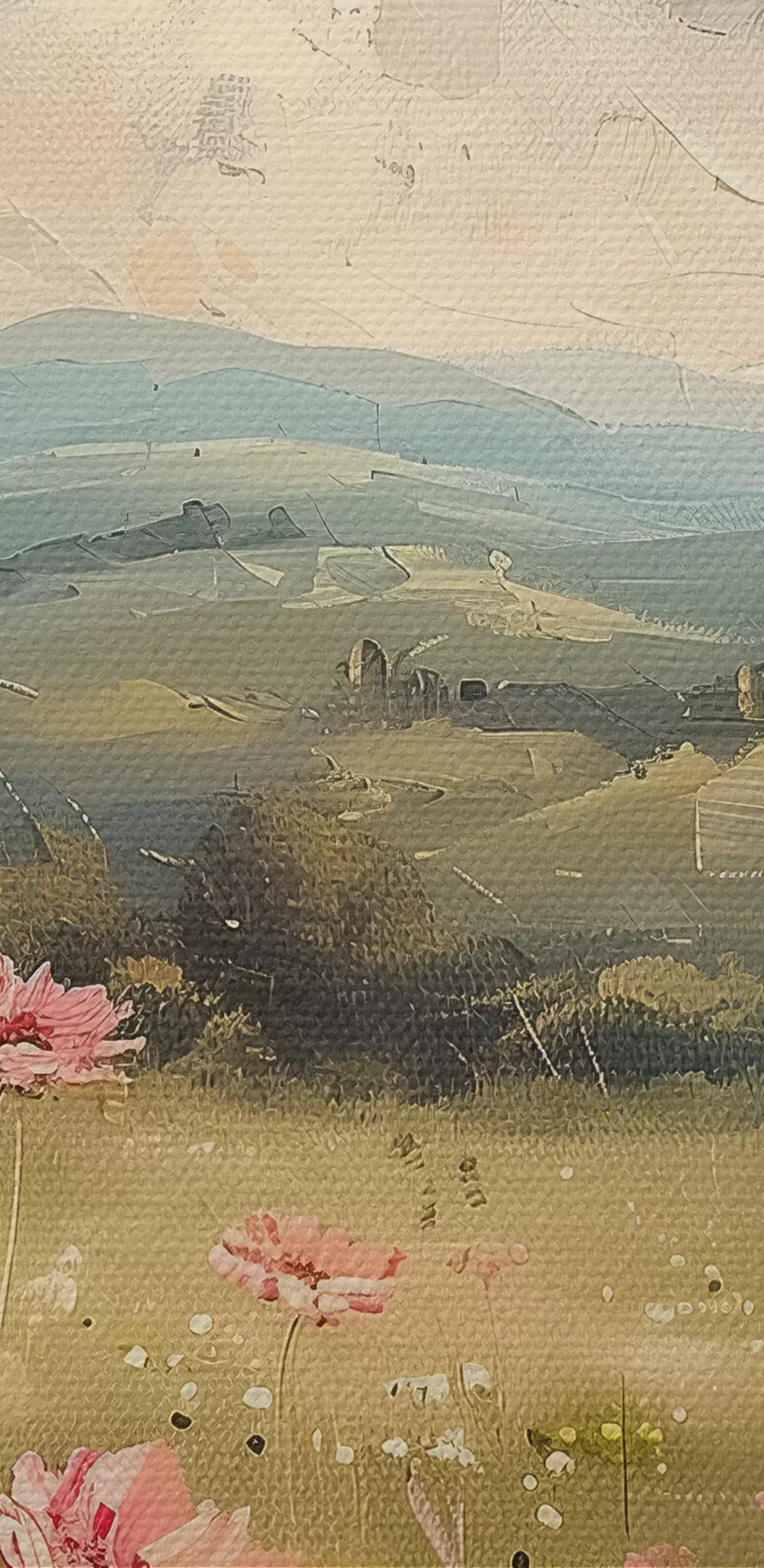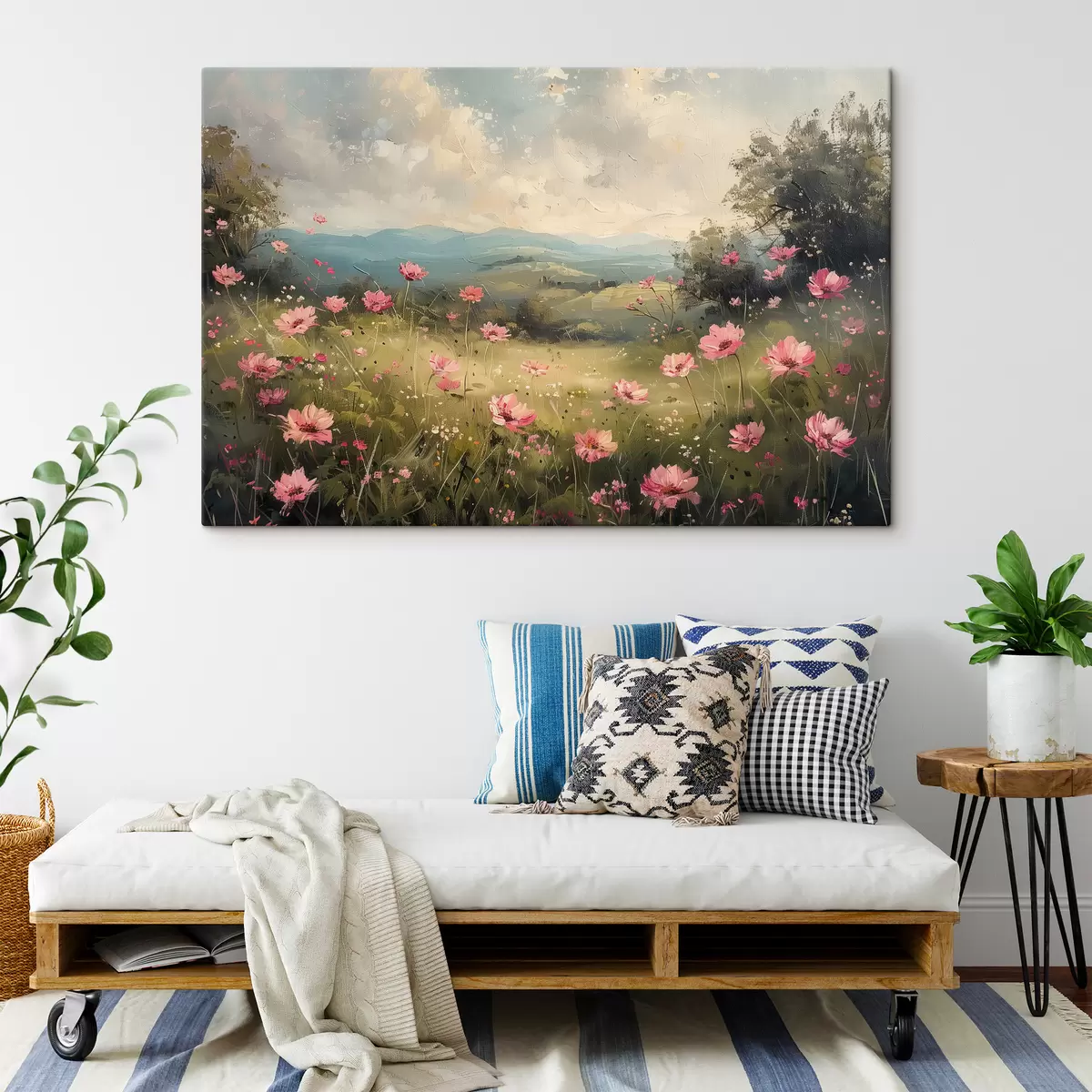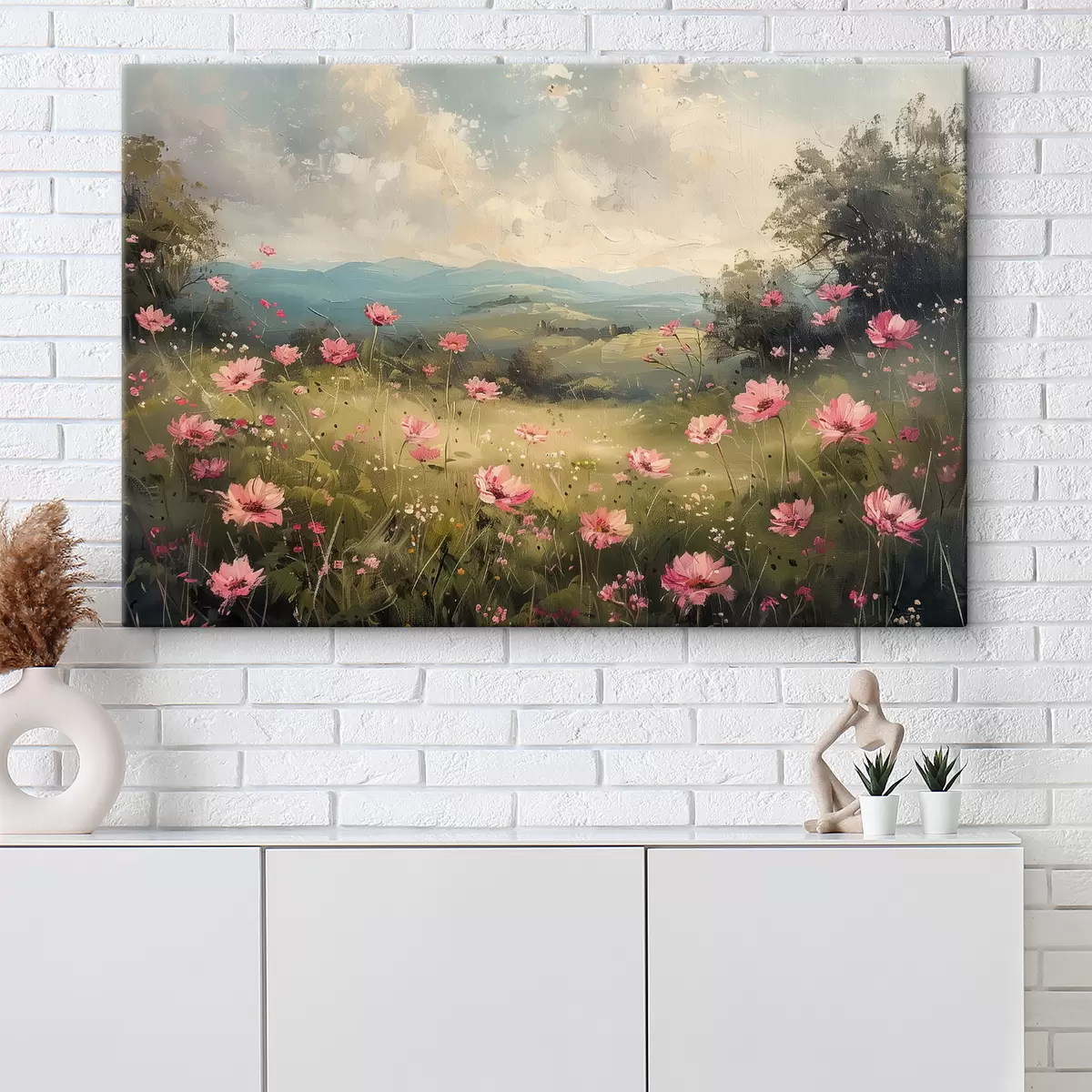 Quadri Prato con fiori rosa, erba verde, paesaggio naturale, cielo con nuvole, disegno acrilico Nr s40234