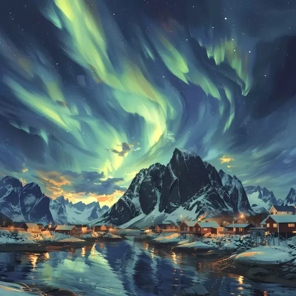 Quadri Isole Lofoten, luci della notte, villaggio invernale Nr s40299