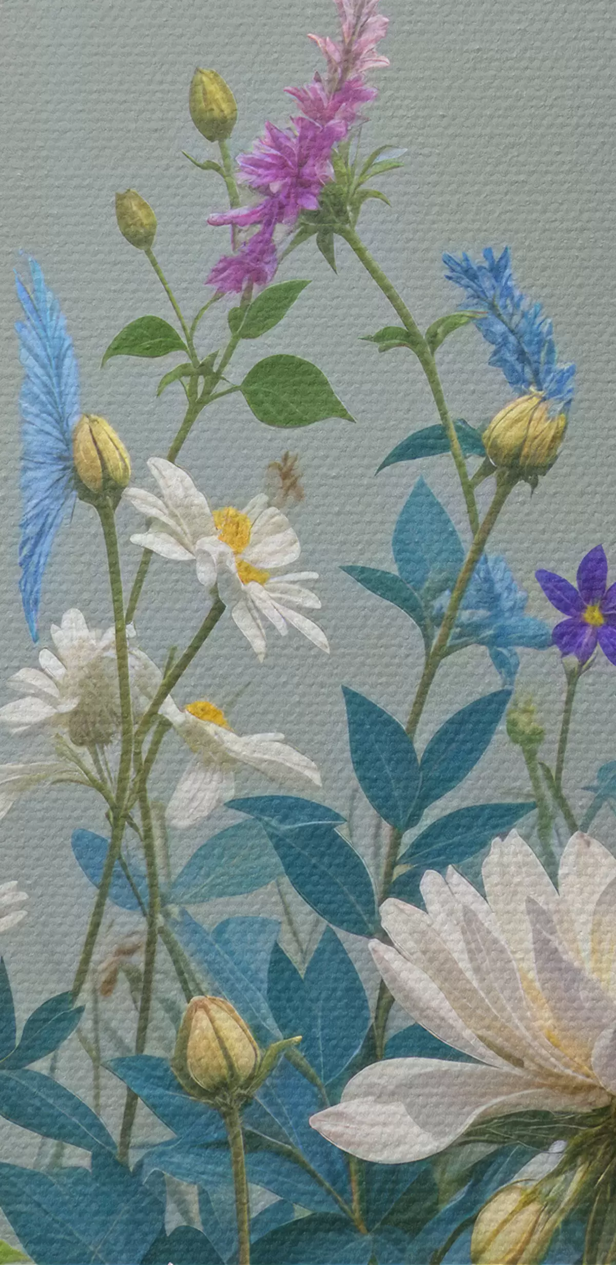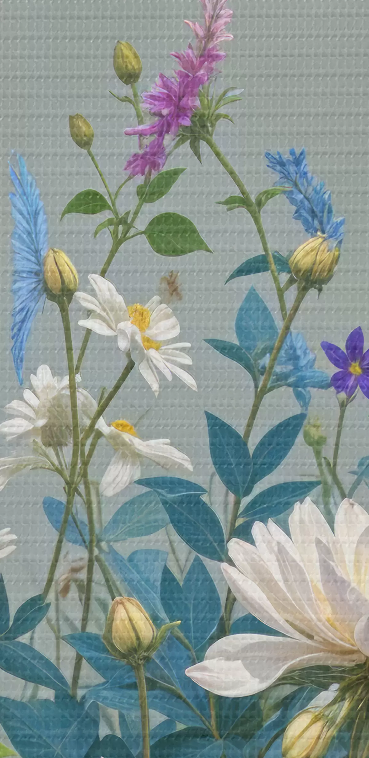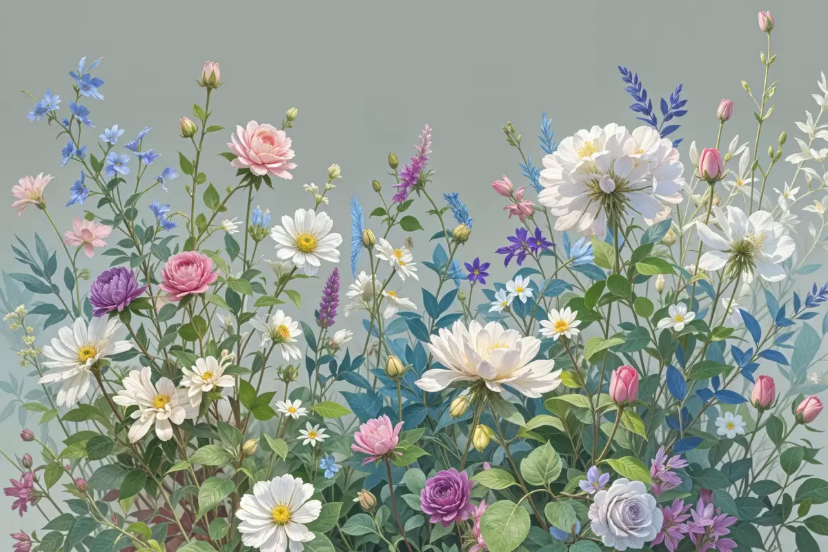carta da parati Un giardino rigoglioso e vivace, ricco di una varietà di fiori colorati e piante in fiore su uno sfondo grigio nr. s40393