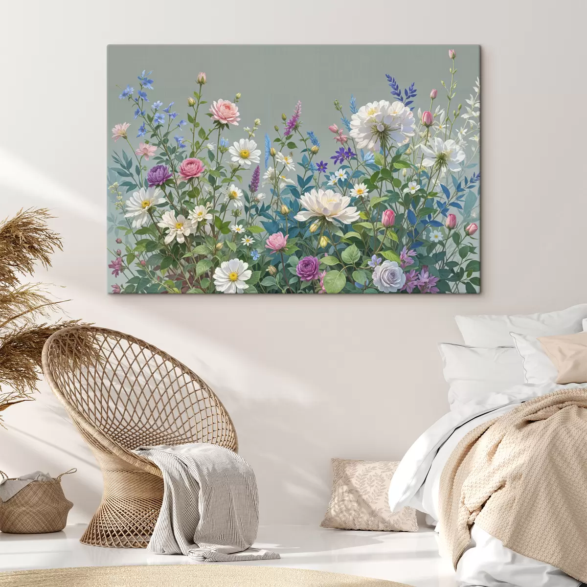 Quadri Un giardino rigoglioso e vivace, ricco di una varietà di fiori colorati e piante in fiore su uno sfondo grigio Nr s40393