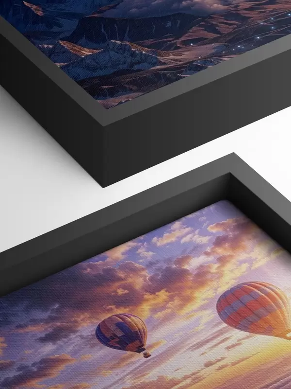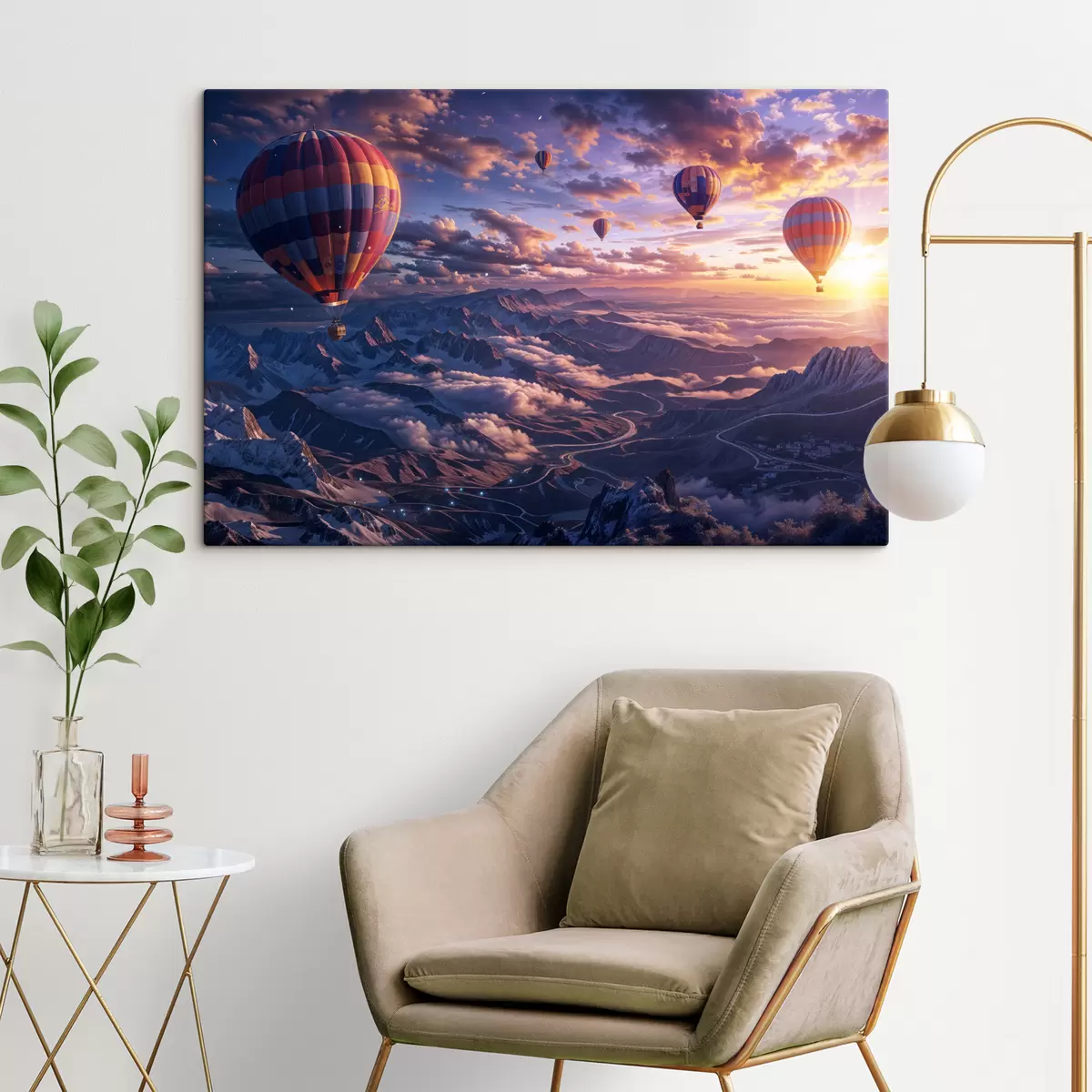 Quadri Mongolfiere che sorvolano un paesaggio montuoso al tramonto, con nuvole e colori vivaci nel cielo Nr s40397