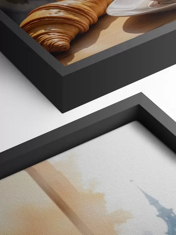 Quadri Una tazza di caffè caldo con il vapore che sale, appoggiata su un tavolo accanto a un croissant, con vista su un edificio storico Nr s40405
