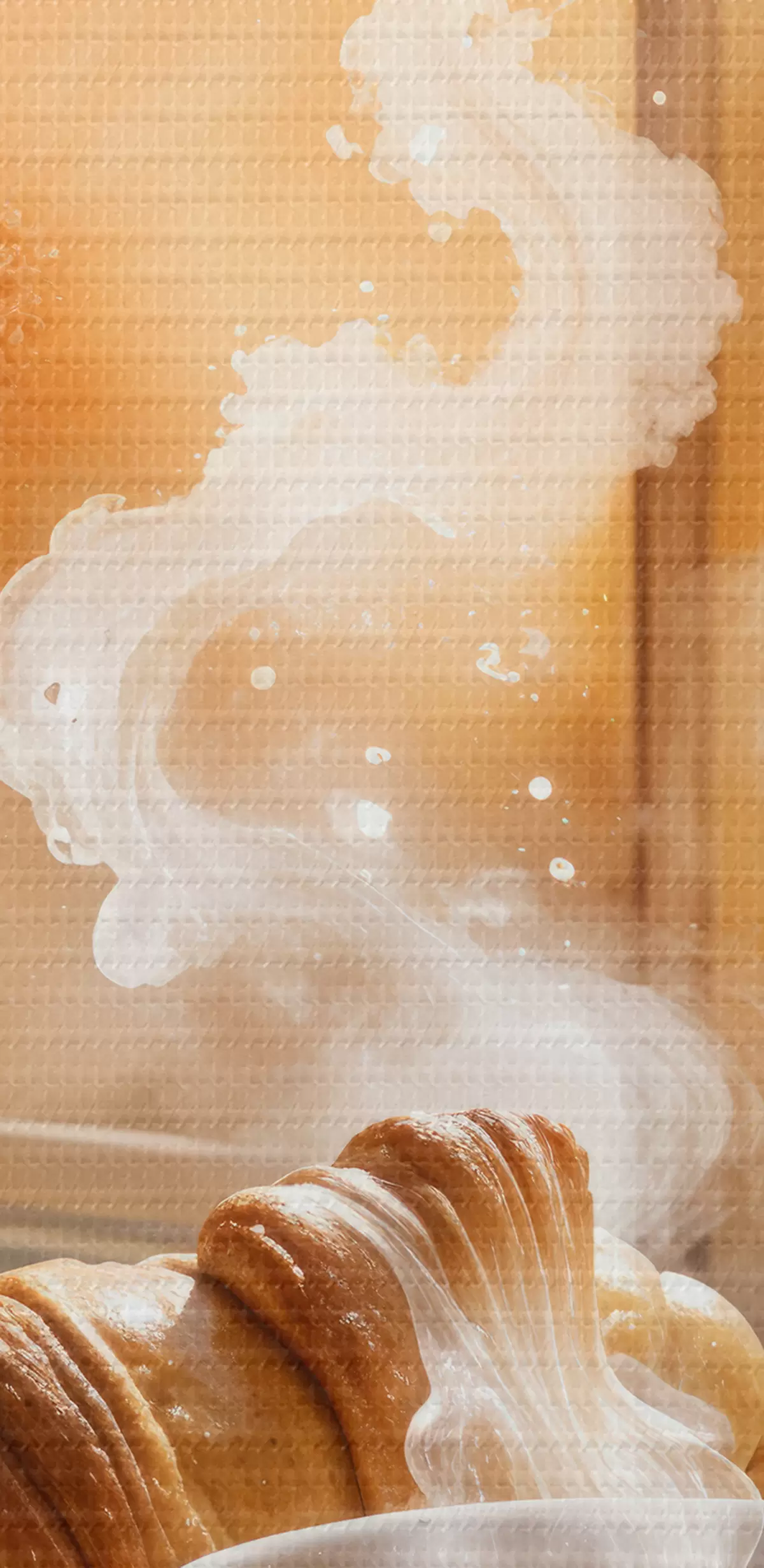 carta da parati Una tazza di caffè caldo con il vapore che sale, appoggiata su un tavolo accanto a un croissant, con vista su un edificio storico  nr. s40405